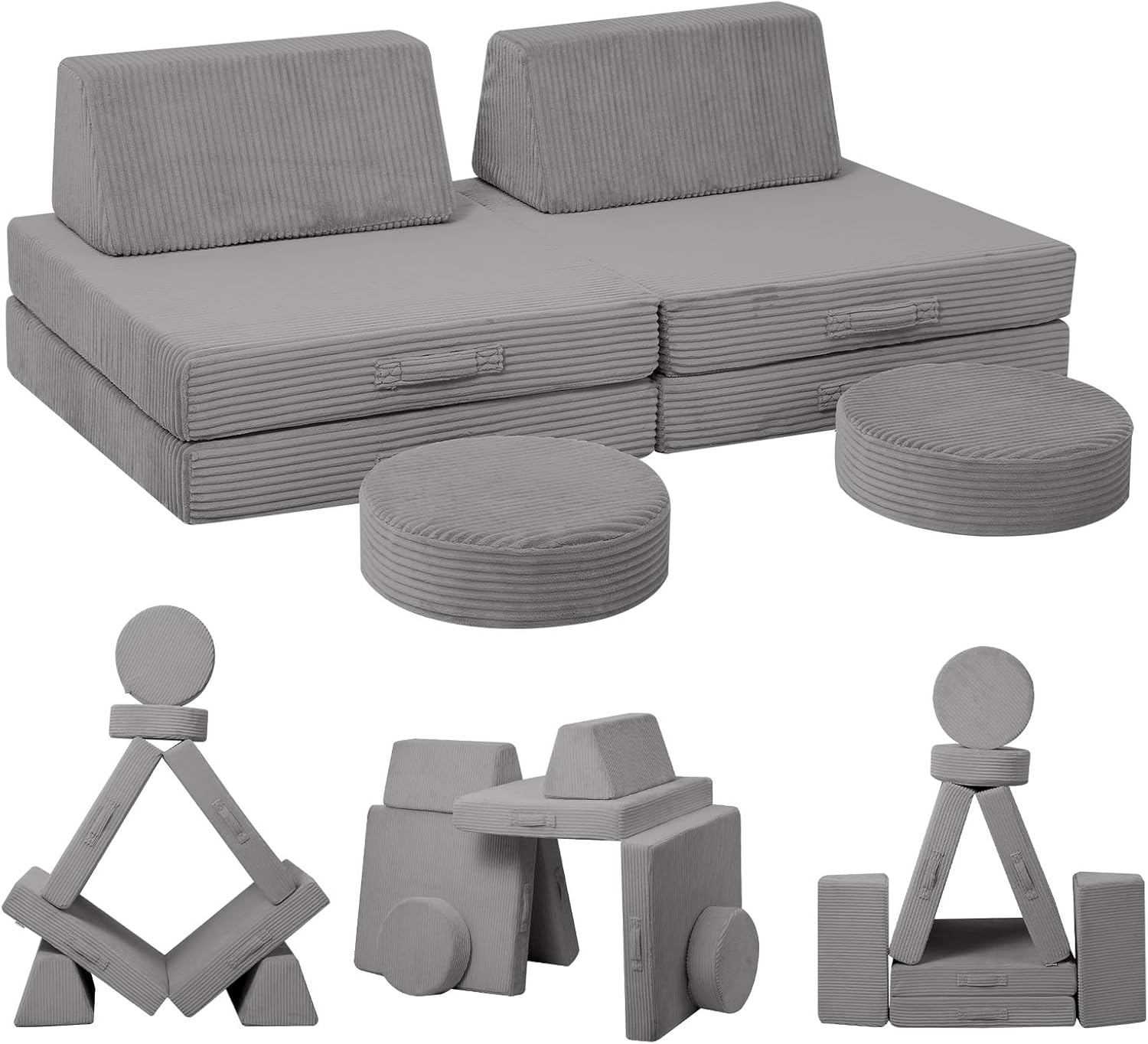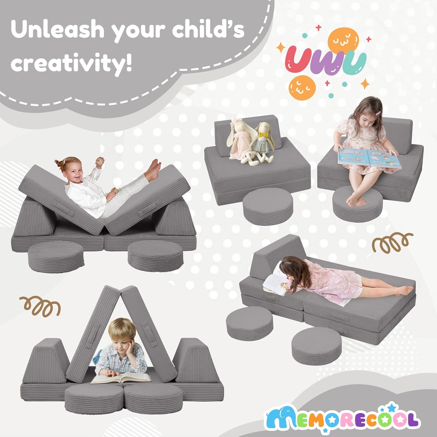 MeMoreCool Kids Couch for Playroom, Corduroy Convertible Toddler Couch, 8 Piece Modular Play Sofa, Foam Fort Building Set for Child Room Furniture, Light Grey