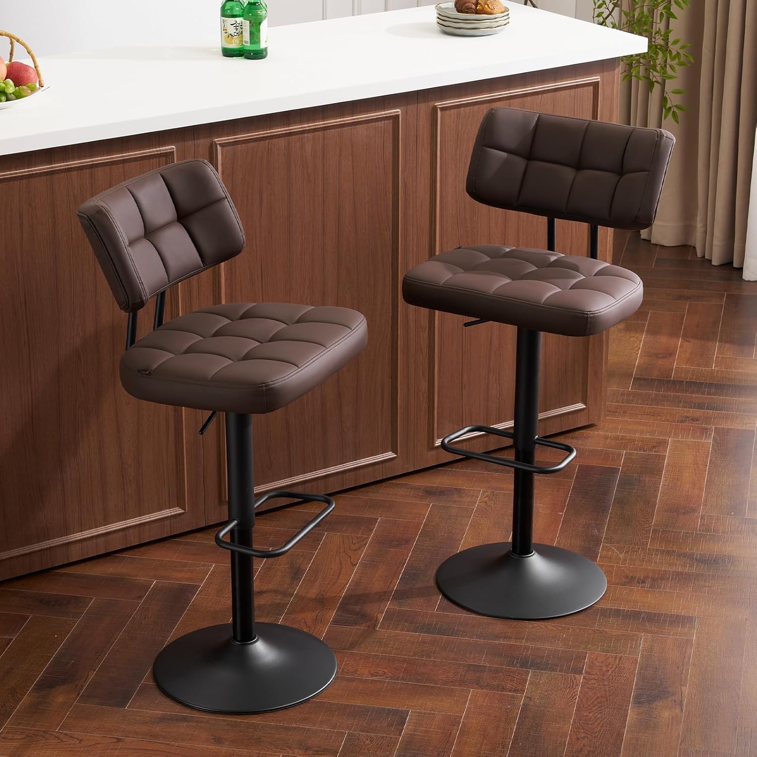 Furniliving Modern Bar Stools Set of 2 Faux Leather, Upholstered Swivel Barstools with Back, Adjustable Bar Chairs Counter Height for Kitchen Island, Dining Space, Brown