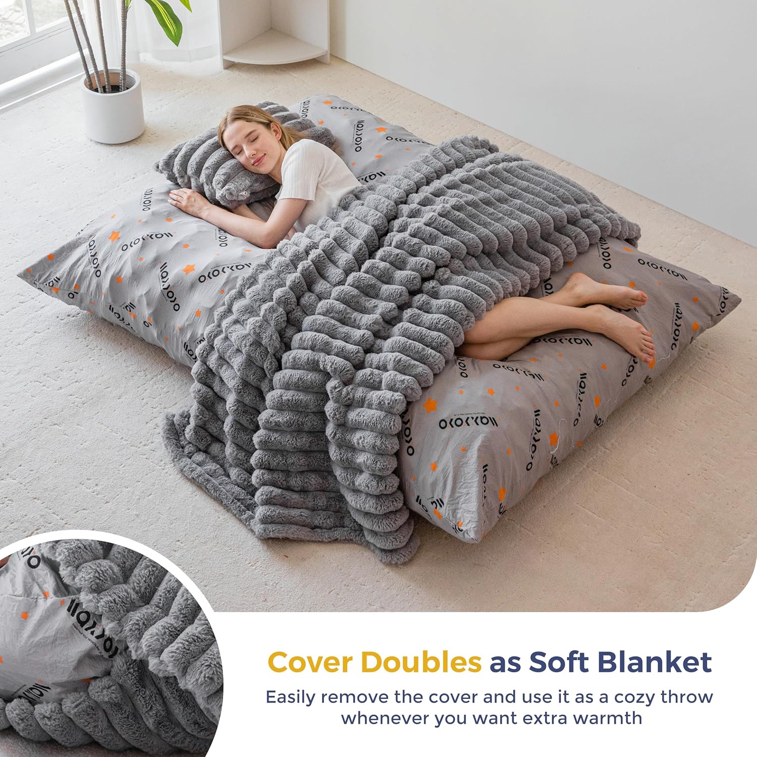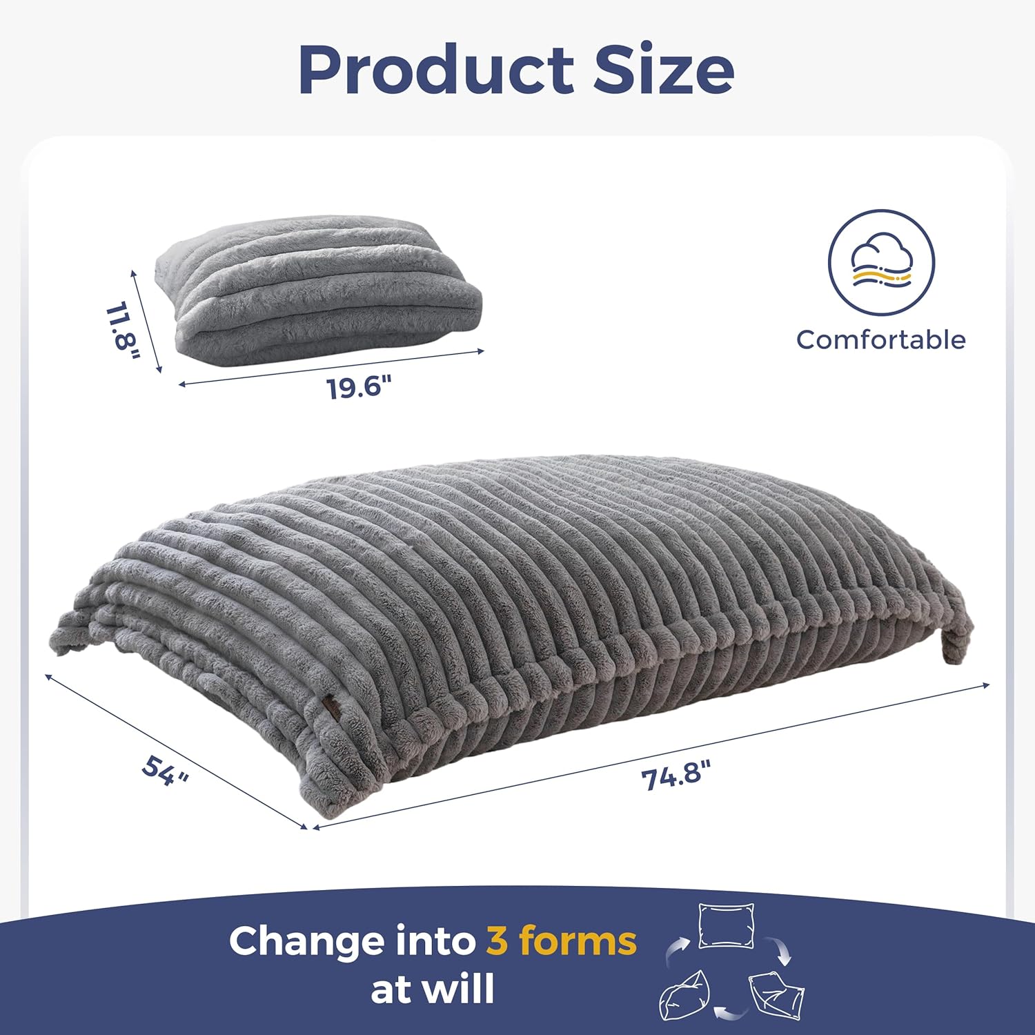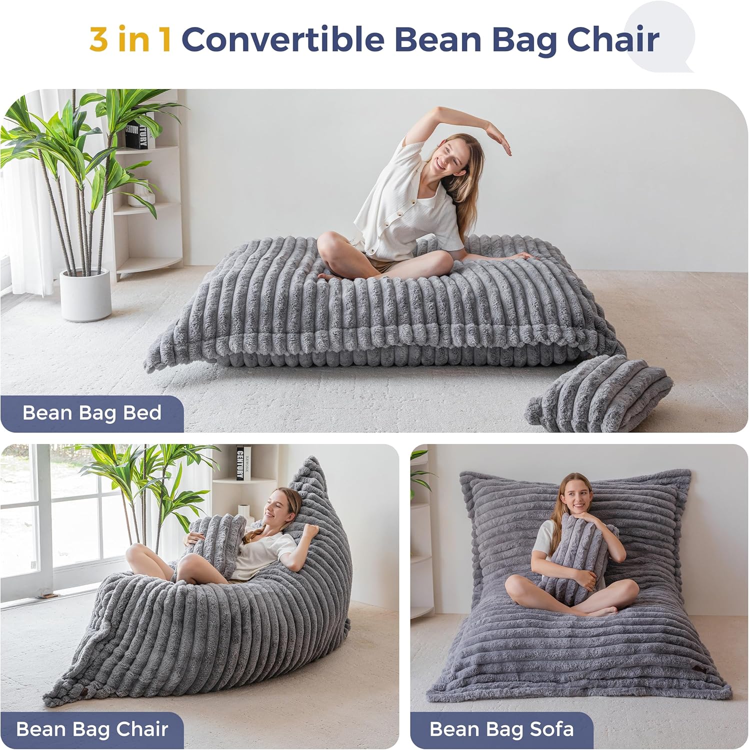 MAXYOYO Giant Bean Bag Chair with Pillow, 3 in 1 Convertible Bean Bag Chair for Adults with Washable Cover, Removable Floor Cushion Stuffed Floor Lounger for Living Room Bedroom, Grey