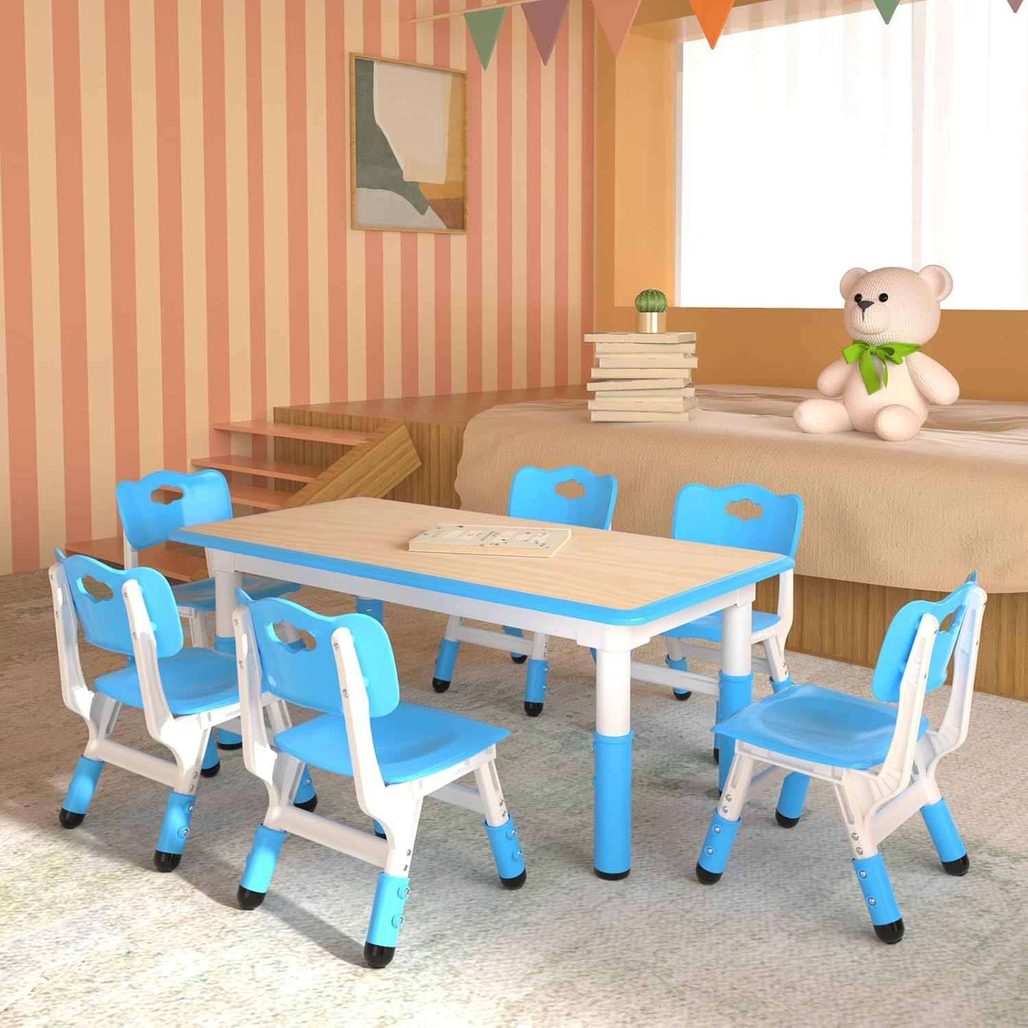 Kids Table and 6 Chairs Set,Height Adjustable Children Table & Chair,Toddlers Study Multi-Activity Table with 47.2"x23.6" Wipe-Clean Desktop,for Classrooms, Homes & Daycares