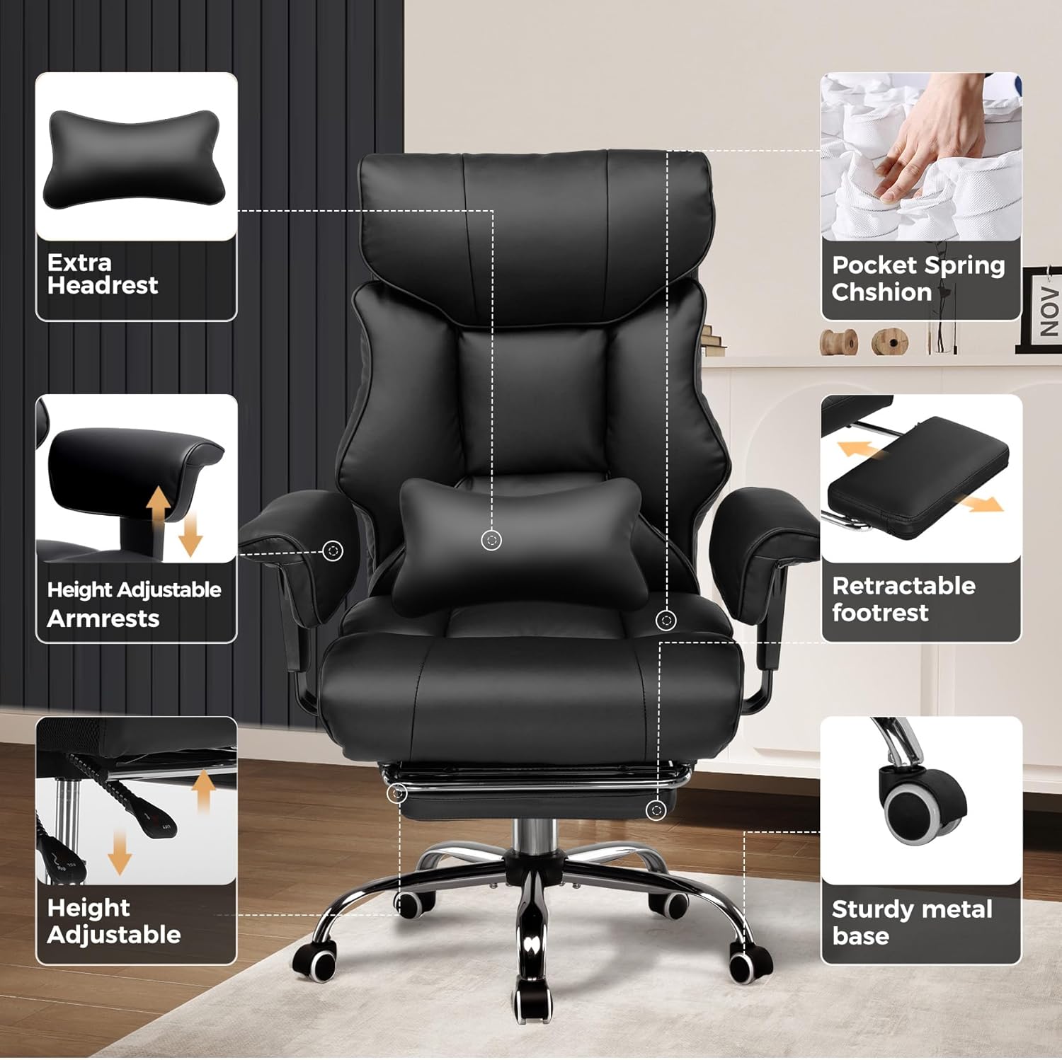 COMHOMA Big and Tall Office Chair 400lbs High Back Computer Gaming Chair with Ergonomic Lumbar Support & Pocket Spring Cushion for Lower Back Pain Relief, Leather Executive Chair with Foot Rest, Black