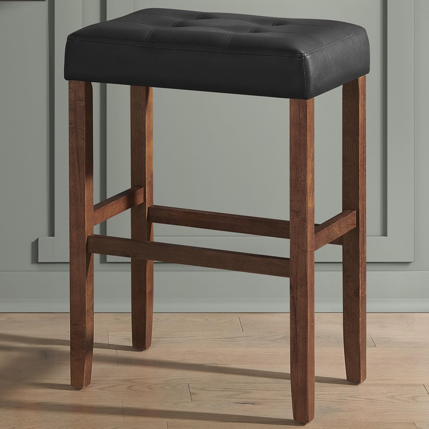 - MODERN RUSTIC DECOR - These kitchen bar stools feature clean lines as well as a backless PU leather saddle seat stuffed with high-density foam and a hand-brushed walnut finish that pair beautifully with farmhouse, coastal, contemporary, and modern décor.