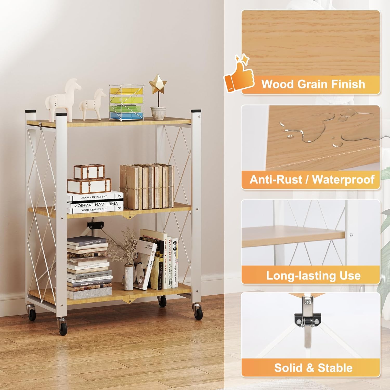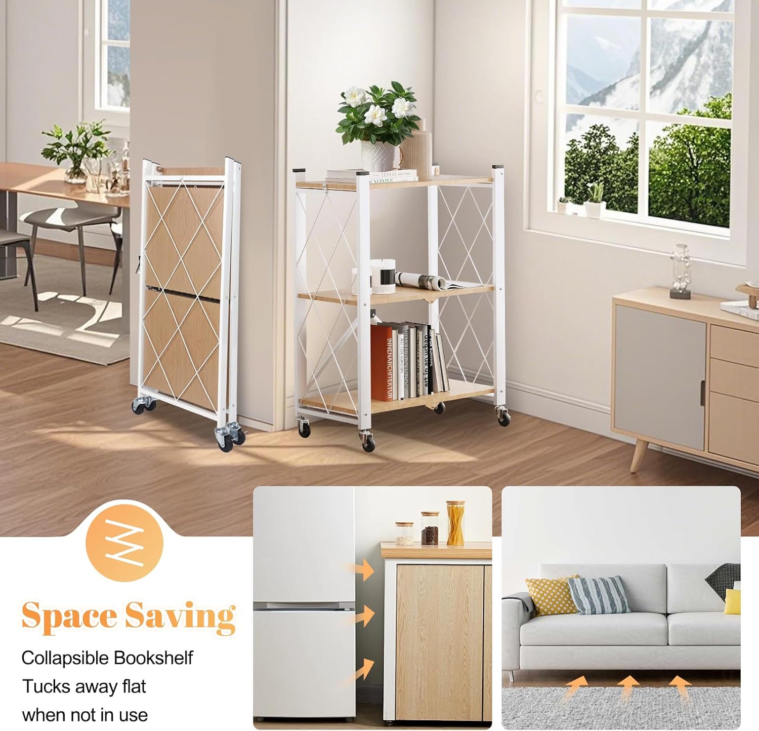 - Space-Saving Multi-Scene Organizer:From basement storage racks to chic living room displays - this 3-tier workhorse transitions seamlessly between spaces. Use as a kitchen spice shelf, laundry room organizer, or home library bookcase. Collapses to flat for apartment-friendly storage between uses