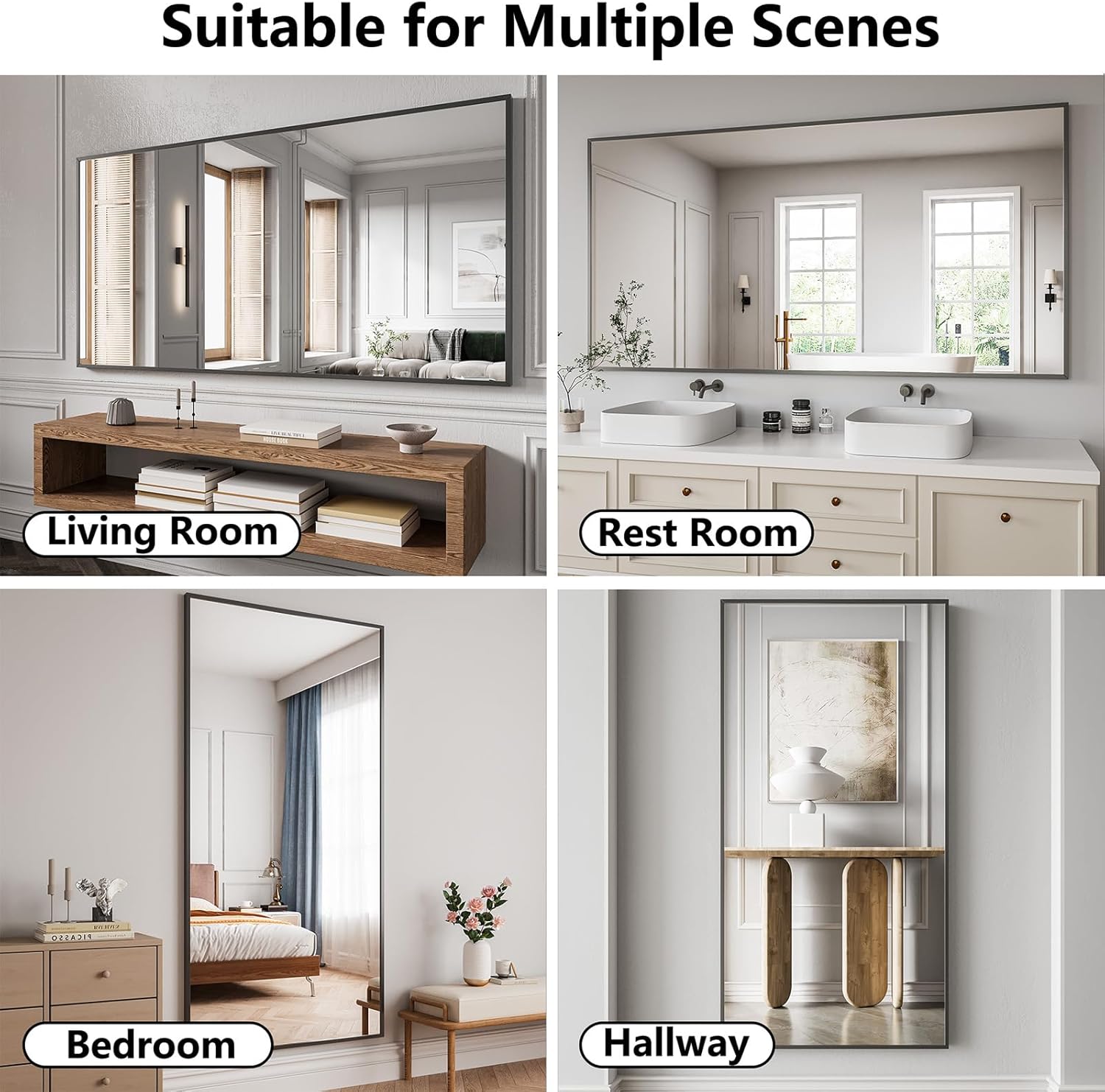 - More Than a Bathroom Mirror: Stylish Versatility for Every Room. Don’t stop at the bath—hang this mirror as a chic wall accent in entryways, living rooms, hotel suites, or walk-in closets. Its neutral black frame blends seamlessly with any decor, serving as both a functional outfit-check mirror and a light-enhancing focal point.