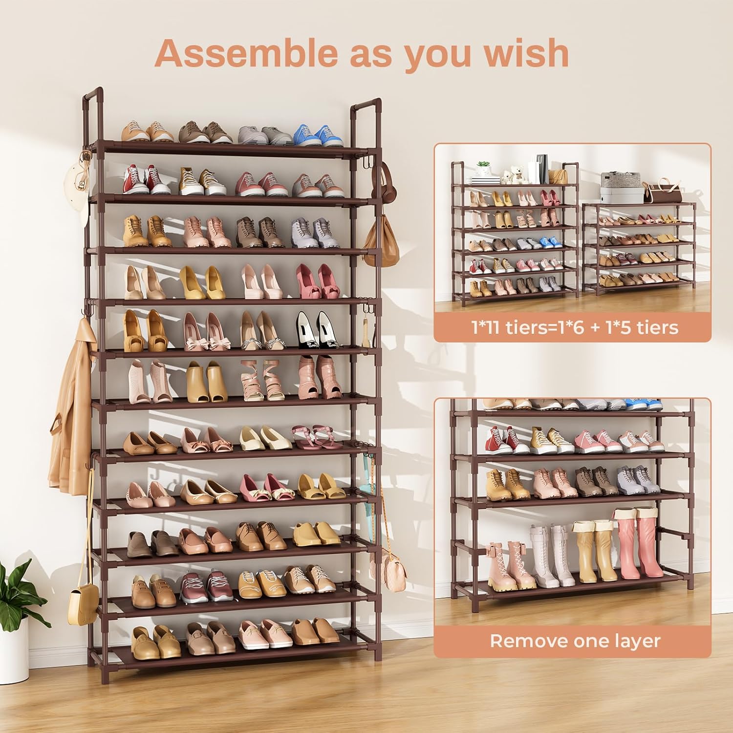 - ăWider, Larger, and Higher 11 Tiers Shoe RackăThe 11 tiers tall shoe rack can store 55 pairs shoes. Make all the shoes in the family clear at a glance, well-organized. This shoe rack is not only suitable for sports shoes and sandals, removing one layer, it can accommodate long boots. Books, plants, etc. can also be placed. It is equipped with 18 hooks that can hang various small items such as umbrellas, bags, and even your jacket, it an excellent shoe rack for versatile use.