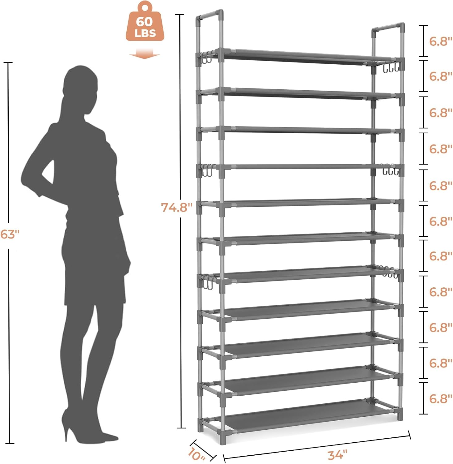 - ăWider, Larger, and Higher 11 Tiers Shoe RackăThe 11 tiers tall shoe rack can store 55 pairs shoes. Make all the shoes in the family clear at a glance, well-organized. This shoe rack is not only suitable for sports shoes and sandals, removing one layer, it can accommodate long boots. Books, plants, etc. can also be placed. It is equipped with 18 hooks that can hang various small items such as umbrellas, bags, and even your jacket, it an excellent shoe rack for versatile use.