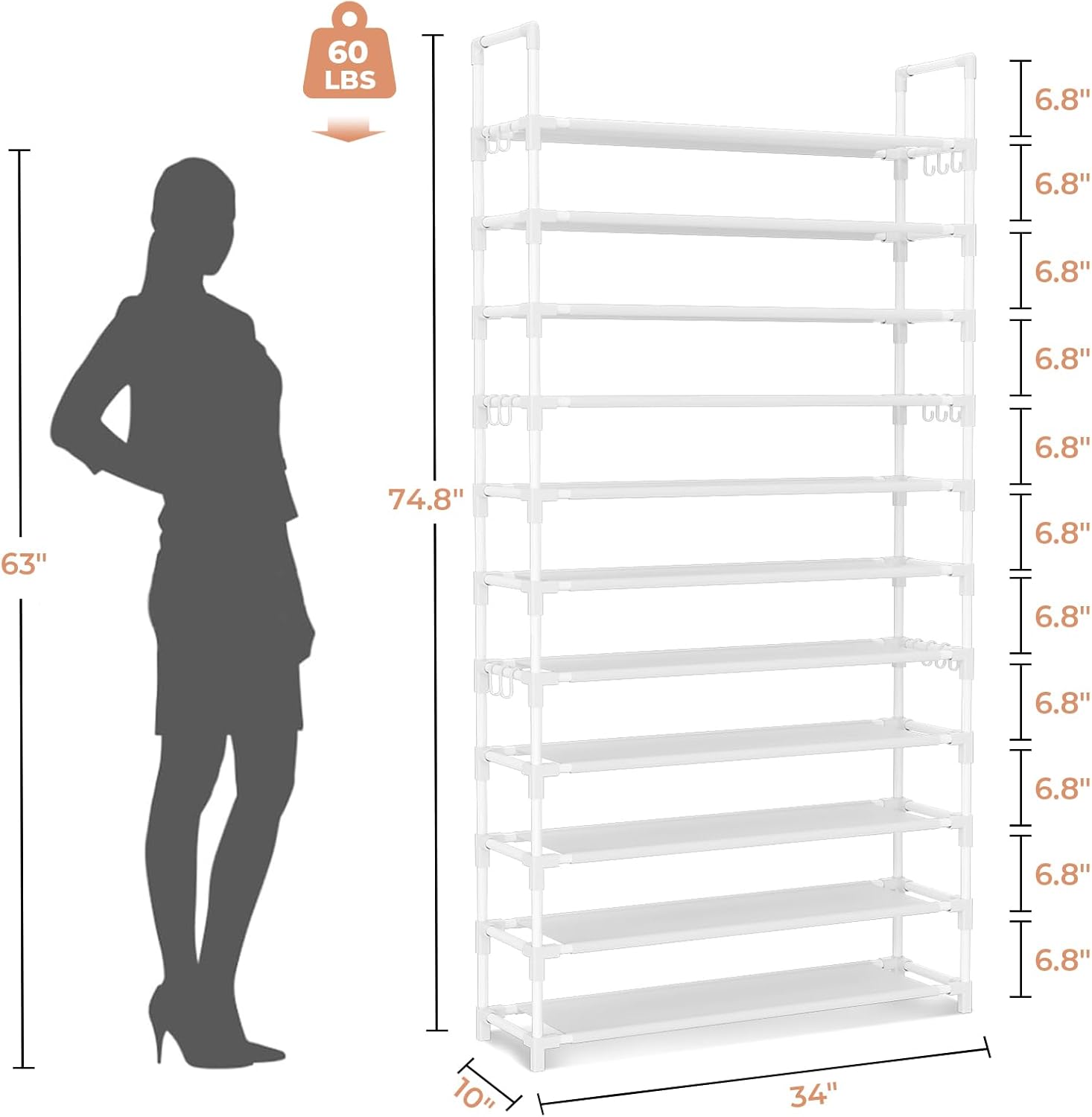 - ăWider, Larger, and Higher 11 Tiers Shoe RackăThe 11 tiers tall shoe rack can store 55 pairs shoes. Make all the shoes in the family clear at a glance, well-organized. This shoe rack is not only suitable for sports shoes and sandals, removing one layer, it can accommodate long boots. Books, plants, etc. can also be placed. It is equipped with 18 hooks that can hang various small items such as umbrellas, bags, and even your jacket, it an excellent shoe rack for versatile use.