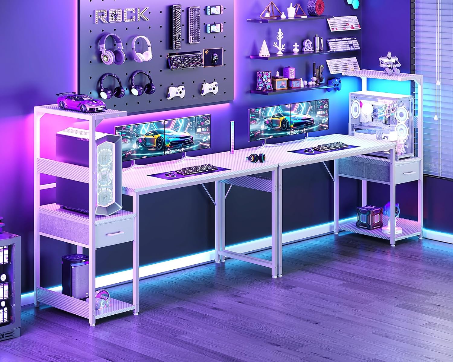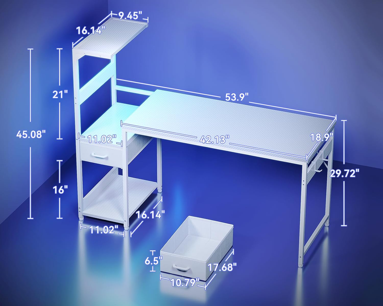 Casaottima 54 Inch Gaming Desk with Storage & LED Lights, Reversible Computer Desk with Display Shelves & Fabric Drawer, Modern Gamer Desk Table with Side Headphone Hook, Carbon Fiber White