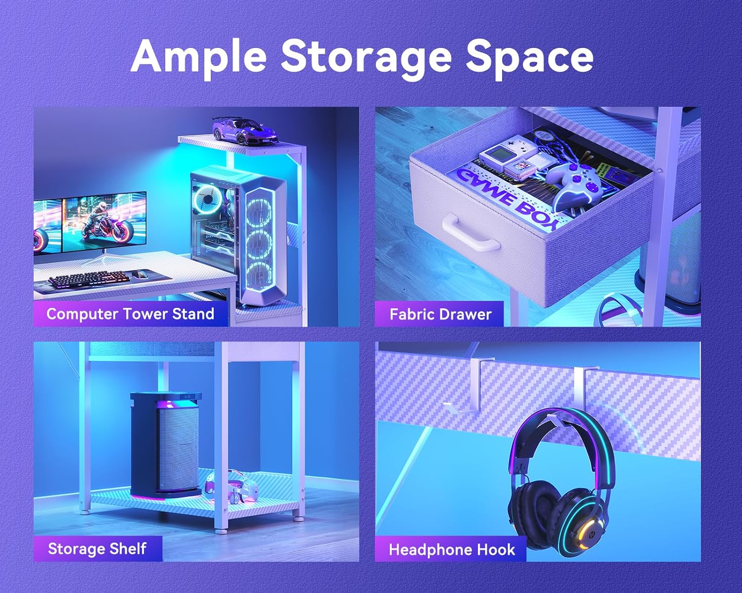 - STORAGE SOLUTIONS: Multiple storage features including fabric drawer, elevated tower platform for your gaming pc case, bottom storage shelf, and convenient headphone hooks for gaming accessories, keeping the desktop neat and tidy.