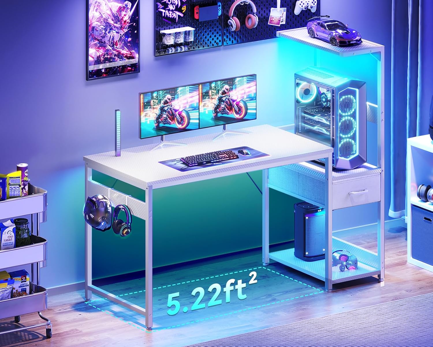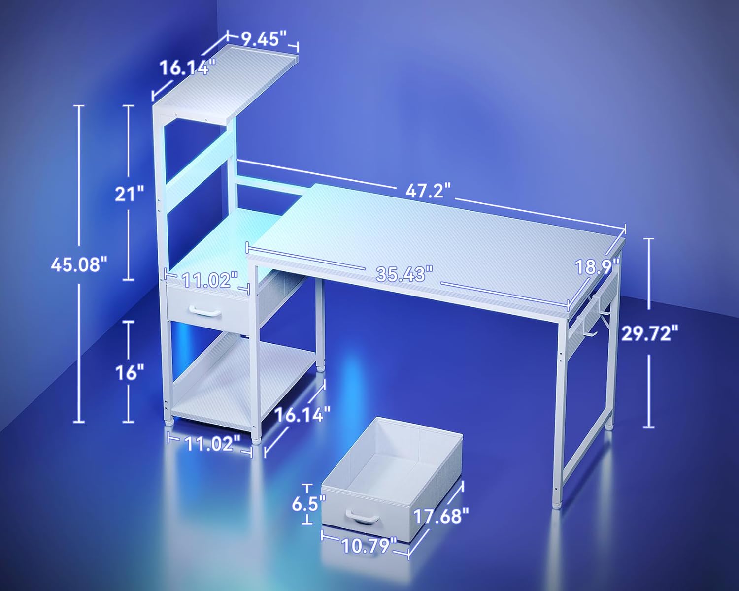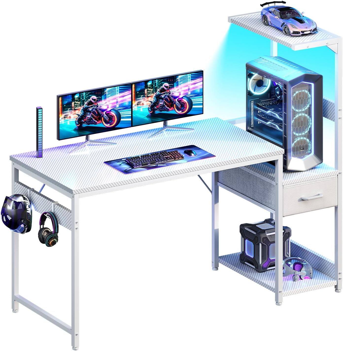 Casaottima 48 Inch Gaming Desk with Storage & LED Lights, Reversible Computer Desk with Display Shelves & Fabric Drawer, Modern Gamer Desk Table with Side Headphone Hook, Carbon Fiber White