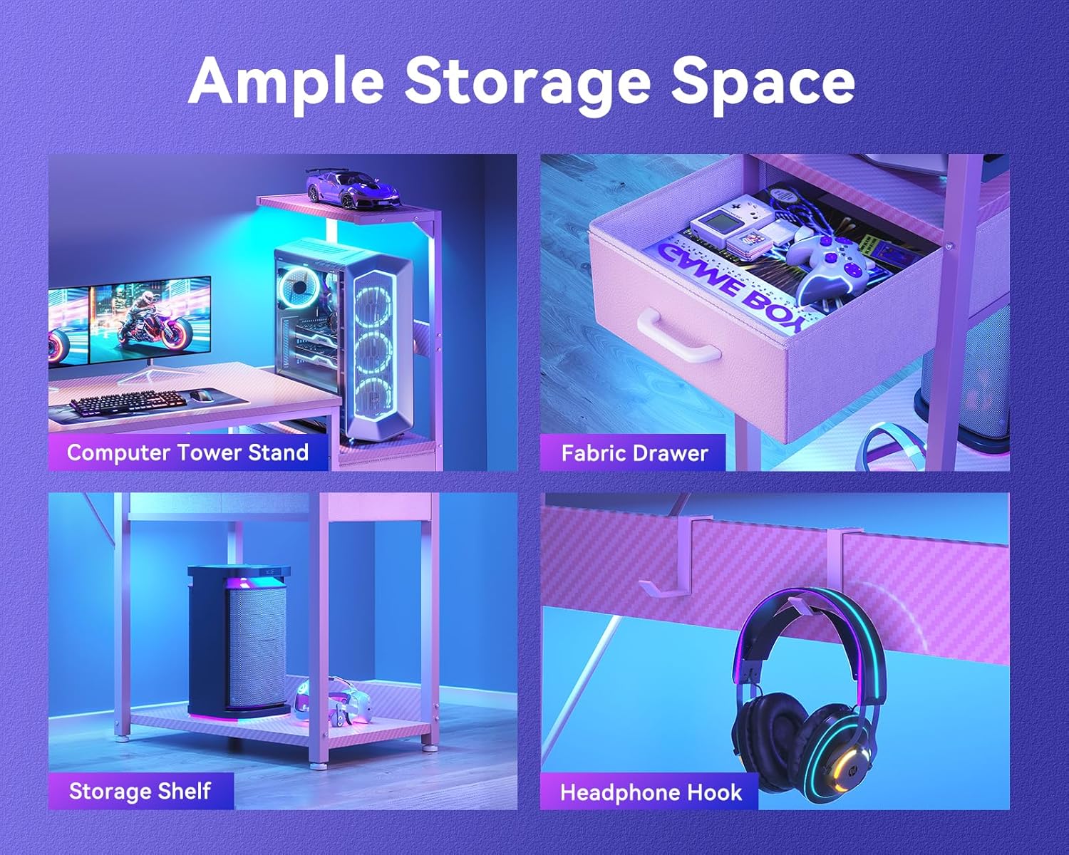- STORAGE SOLUTIONS: Multiple storage features including fabric drawer, elevated tower platform for your gaming pc case, bottom storage shelf, and convenient headphone hooks for gaming accessories, keeping the desktop neat and tidy.
