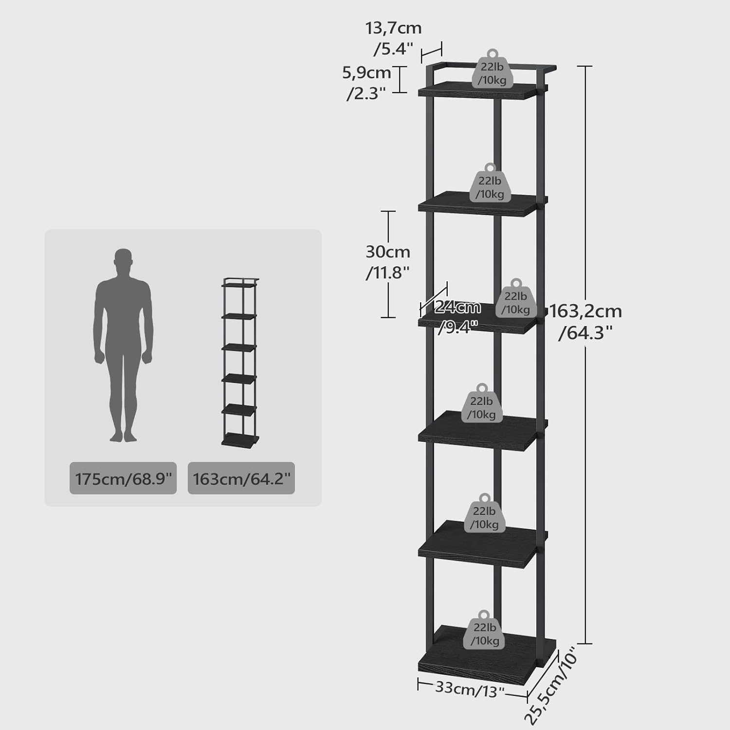 Bookshelf, 6-Tier Bookcase, Vertical Tall Narrow Book Shelf for Small Space, Open Storage Display Shelf with Stable Base & Anti-Tip Kits, for Living Room, Office, Study, Black BKBK11601