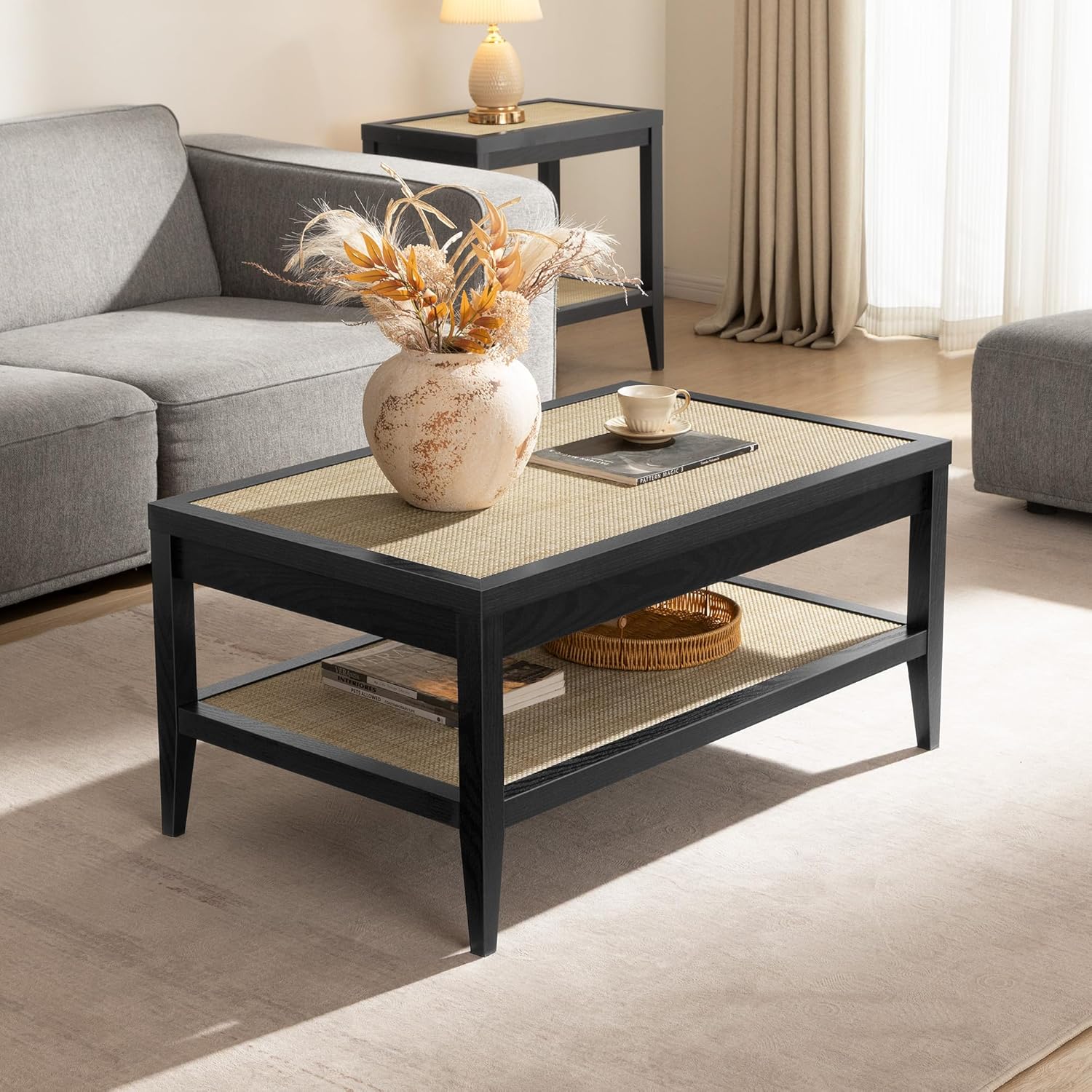 SICOTAS Rectangle Coffee Table for Living Room, Farmhouse Boho Center Table with 2-Tier Rattan Storage Shelves, Sofa Side Accent Table for Small Space, Black Oak