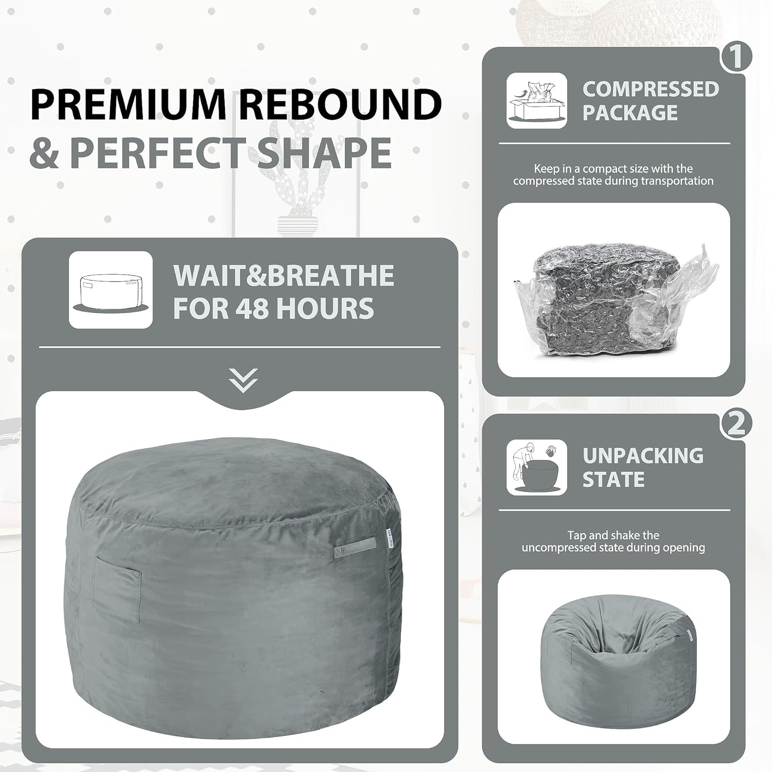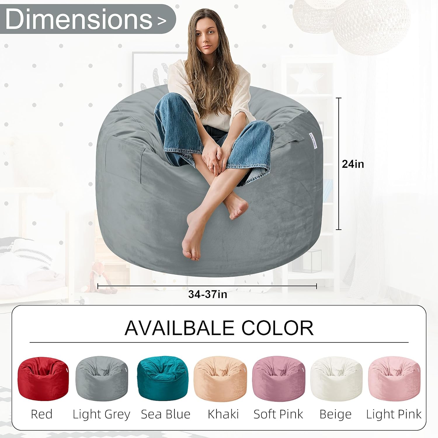 HABUTWAY Bean Bag Chair 3Ft Luxurious Velvet Ultra Soft Fur with High Rebound Memory Foam Bean Bag Chairs for Adults Plush Lazy Sofa with Fluffy Sponge 3' (Light Grey)