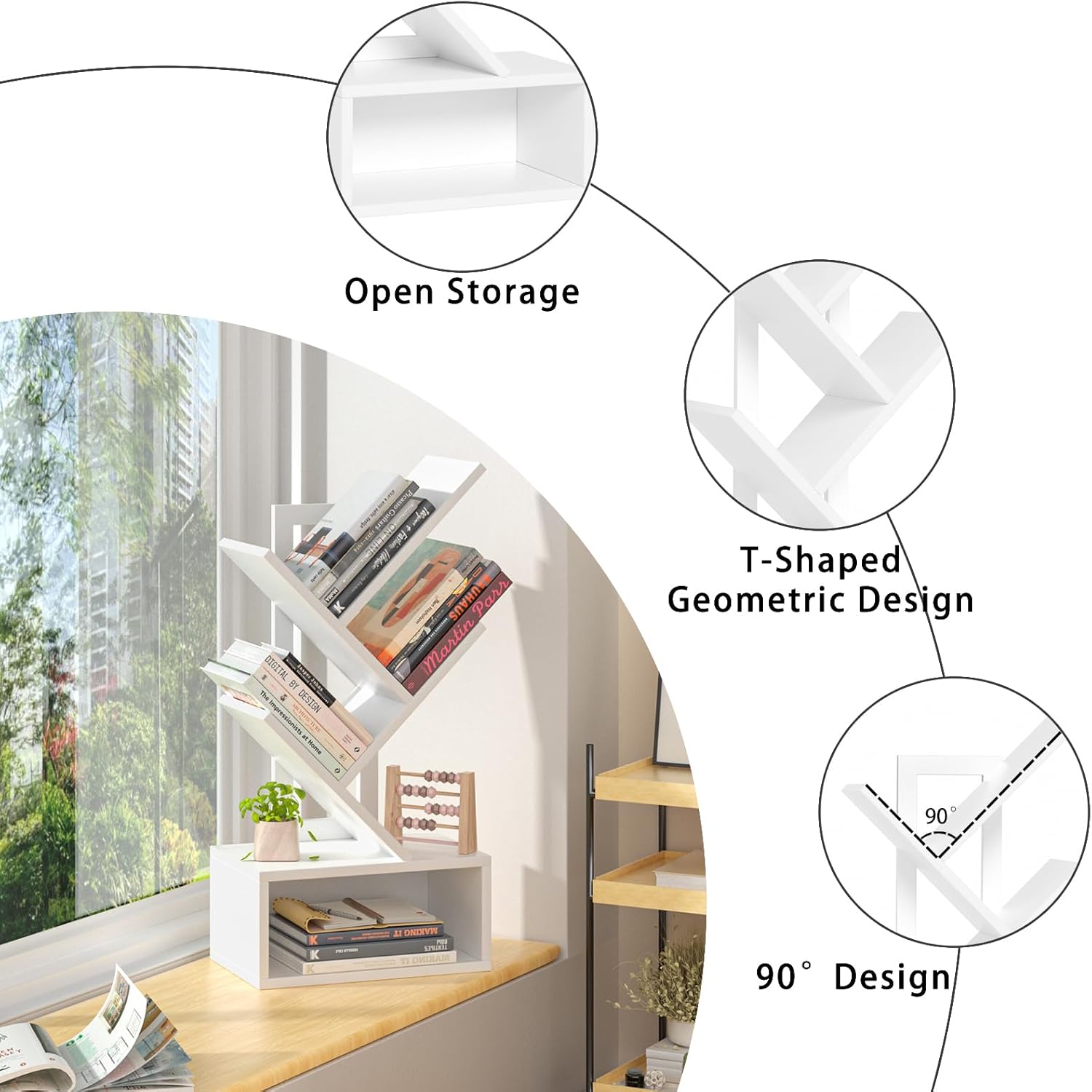 - š² [Ingenious Design] Each open storage shelf can hold 5-10 books. The T-shaped geometric design ensures stability, providing enough support for the weight of your books without tipping over. The hollow design of the backboard makes it easy to move this small bookshelf.