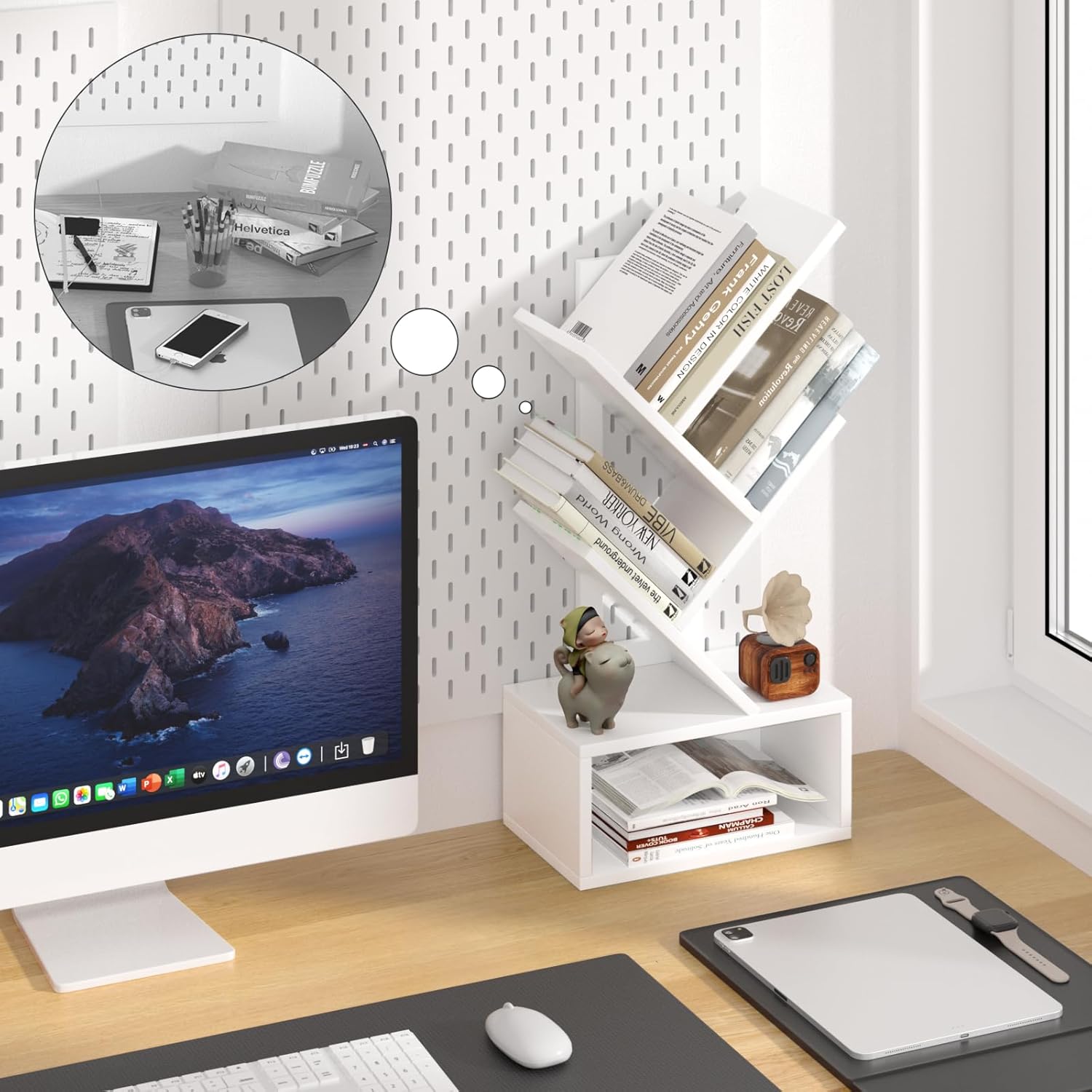 - š² [Small Tree Bookshelf] The inspiration for this 5-tier small tree bookshelf comes from trees in nature. The tree-shaped design provides ample categorized storage space for your books and office supplies, helping to keep your desktop clutter-free. This charming bookshelf is a perfect companion for you and your family while working and studying.