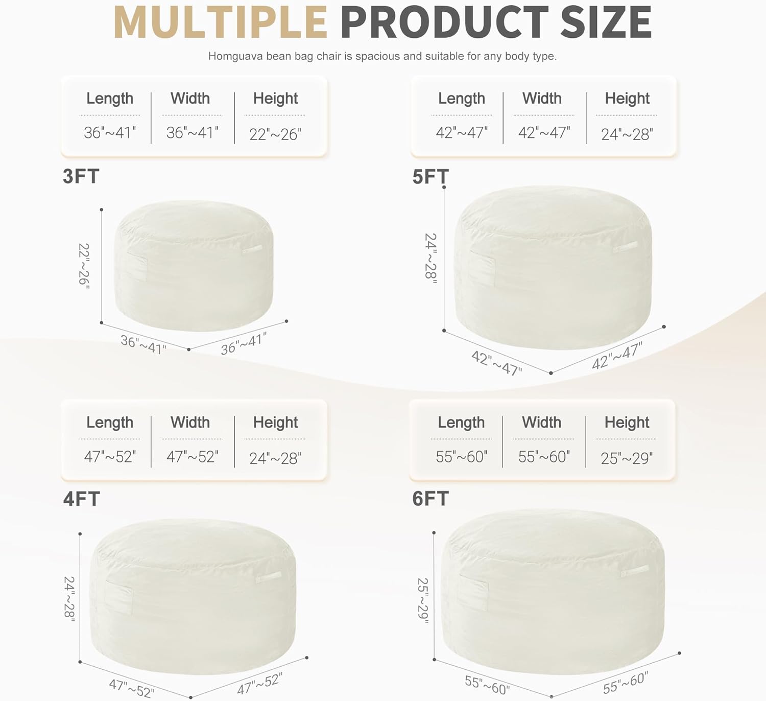 - Memory Foam Filler: Homguava bean bag chair with filling comes with a separate condensed liner package. Once you receive it, please do not leave it for too long and open the package ASAP. After opening, please flip the whole beanbag chair up and roll it a few times, then leave it for about 48 hours, it will expand perfectly.The bean bag is full-filled with memory foams, which has a high resilience, bearing more and increasing the comfort of sitting.