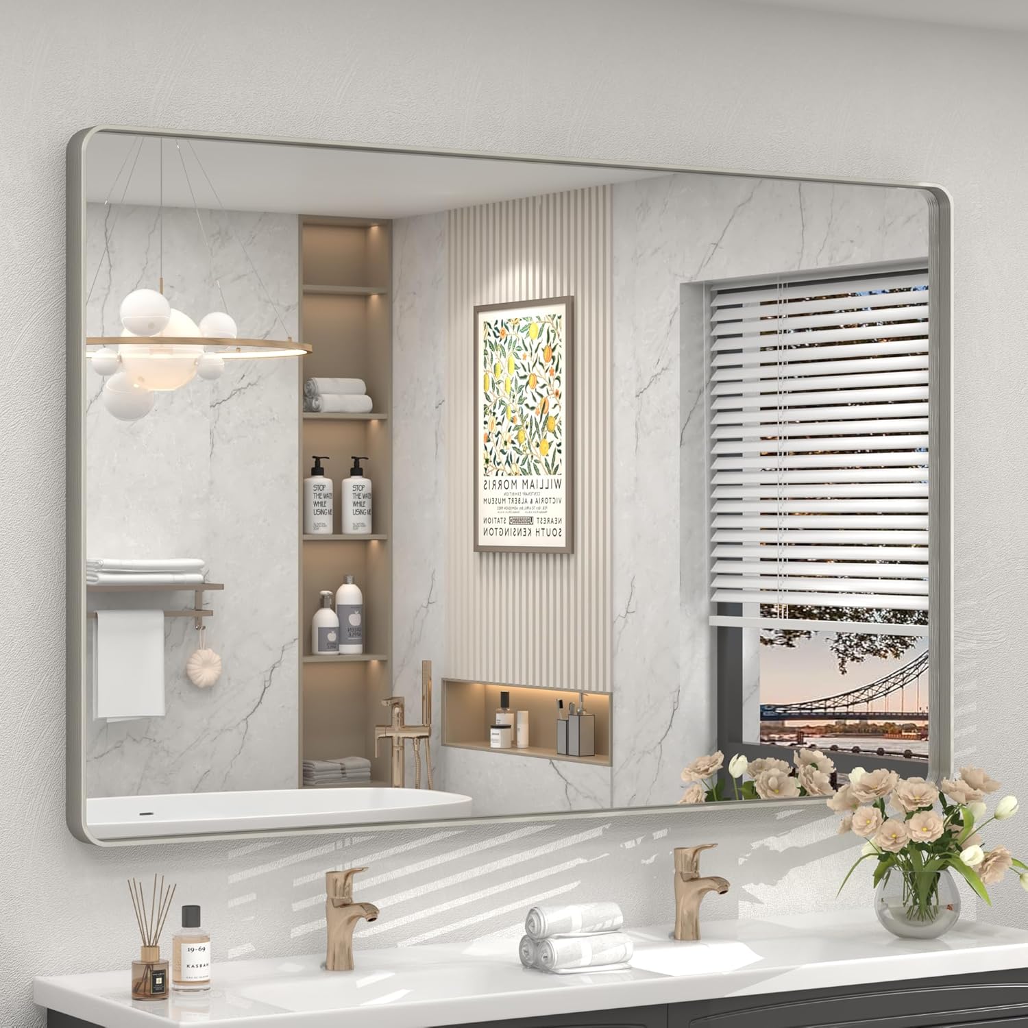 55x40 Silver Brushed Nickel Bathroom Mirror for Wall, Rounded Rectangle Silver Framed Bathroom Vanity Mirror, Anti-Rust, Shatterproof, Hangs Horizontally or Vertically