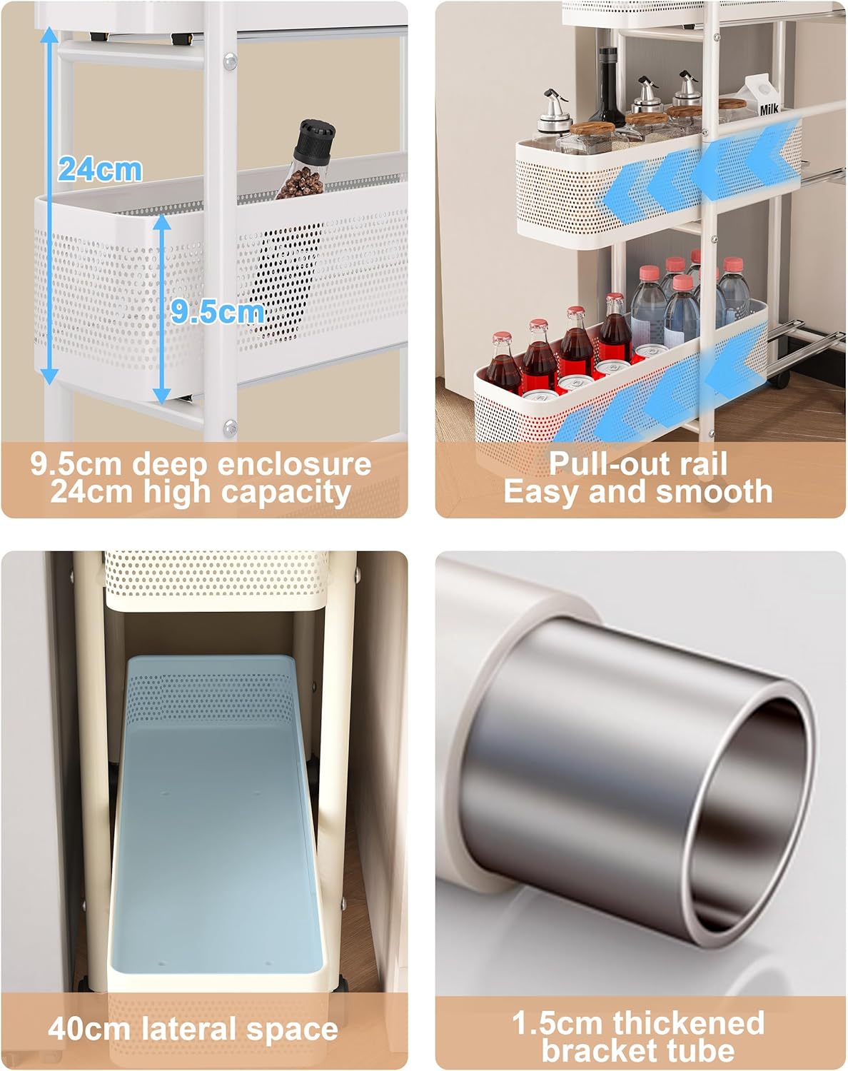 - Smooth, Silent Sliding: Equipped with high-quality, silent tracks, each shelf glides smoothly and quietly. Unlike typical carts that are fixed in place, this cart allows you to effortlessly pull out and slide shelves for easy access to your items—no noise, no hassle.