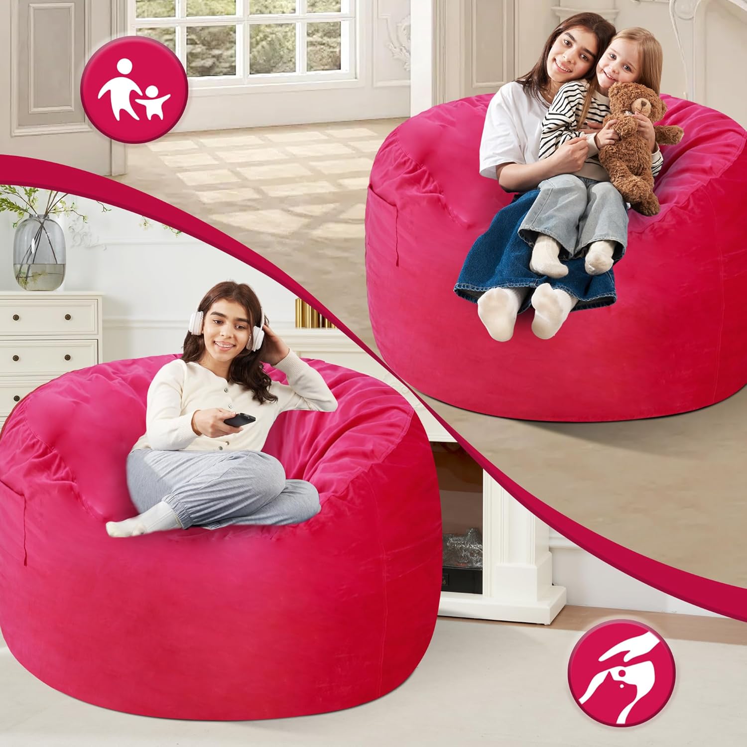 - Thoughtful Details: The adult bean bag chairs adopt the zipper hidden design that will not affect the beautiful appearance of the cozy chair at all. One large side pocket is also added to hold mobile phones, tablets, books, and some small items at any time. The large handle makes it more convenient to move the large bean bag chairs, allowing you to lie down and enjoy your personal time in every corner of the house