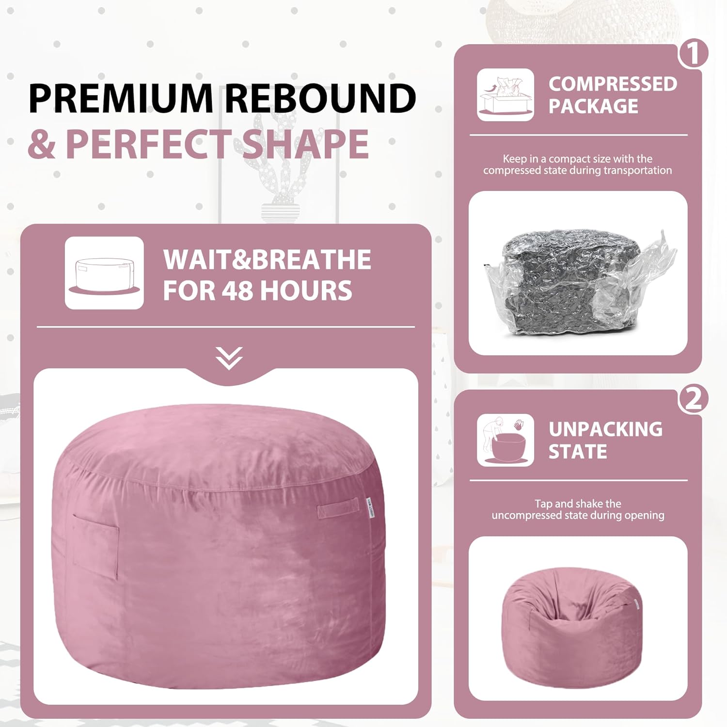 - BEAN BAG CHAIRS WITH FILLING - HABUTWAY bean bag chair is filled with premium memory foam which makes easy to rebound and maximum soft. Giant bean bag chair comes in a condensed box, once open, the bean bags start to expand within few minutes. It will take 3-7 hours to become more supportive. Shake the whole bean bag chair after using a period, it will bounce back with comfort.