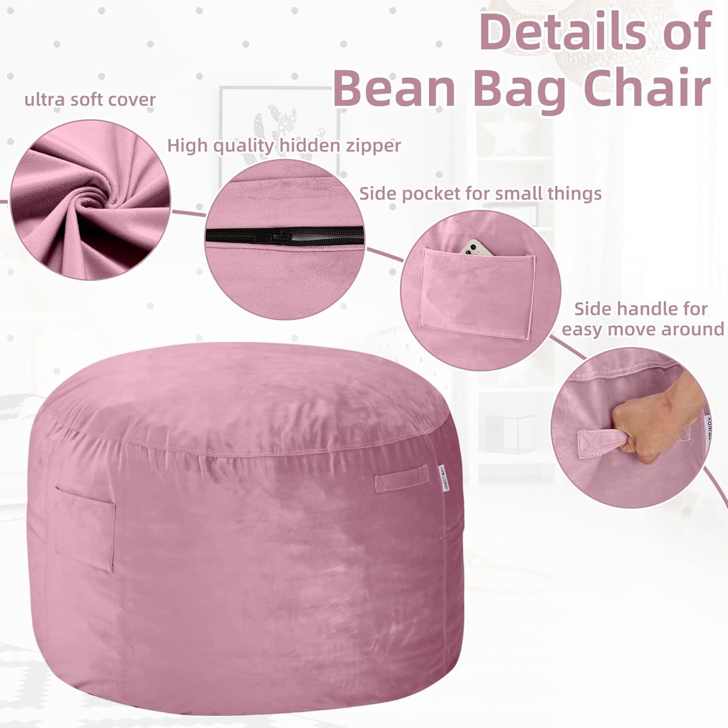 - CONVENIENT DESIGN - For easy mobility, our bean bag chairs are designed with a handle, so you can move it where you want. There is a medium-sized pocket on the side of a comfy chair, you can store your mobile phones, remote control, books, and some small items.