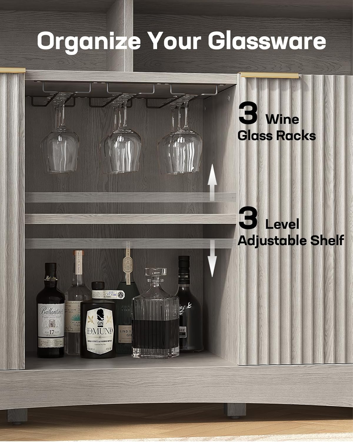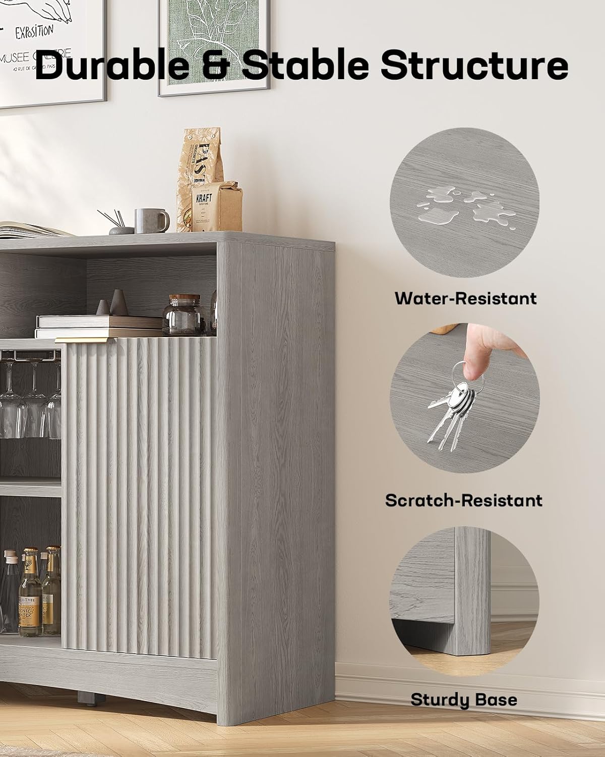 - Elegant and Contemporary Design: Engineered with an exquisite fluted panel design, this wine bar cabinet effortlessly enhances any space with its modern charm and artistic flair. Whether placed in your living room, dining area, or kitchen, it serves as both a functional storage solution and a stylish statement piece.