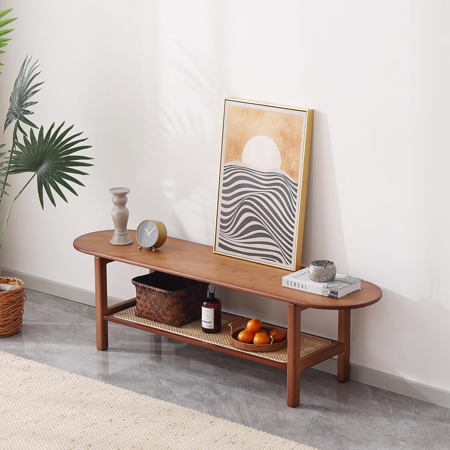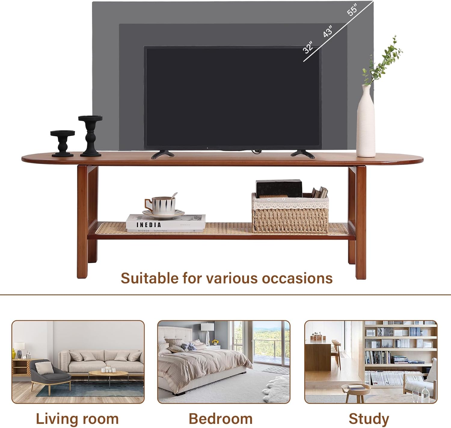 - Rattan TV Stand to 55" 60": The TV cabinet in our picture takes a 32" TV cabinet as an example. Measuring 55.1x11.8x12.8 inches, this bamboo TV stand can hold up to a 65-inch flat screen TV. Its spacious tabletop isn't just perfect for TVs but also ideal for displaying decorations like photos and vases. Versatile for living rooms and bedrooms, it infuses elegance and charm into any room it graces