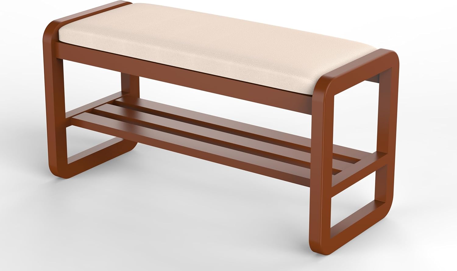Solid Wood Shoe Rack, 2 Tier Shoe Storage Bench with Cushion Seat, 10 Pair Shoe Organizer for Entryway, Cherrywood, 39 Inch