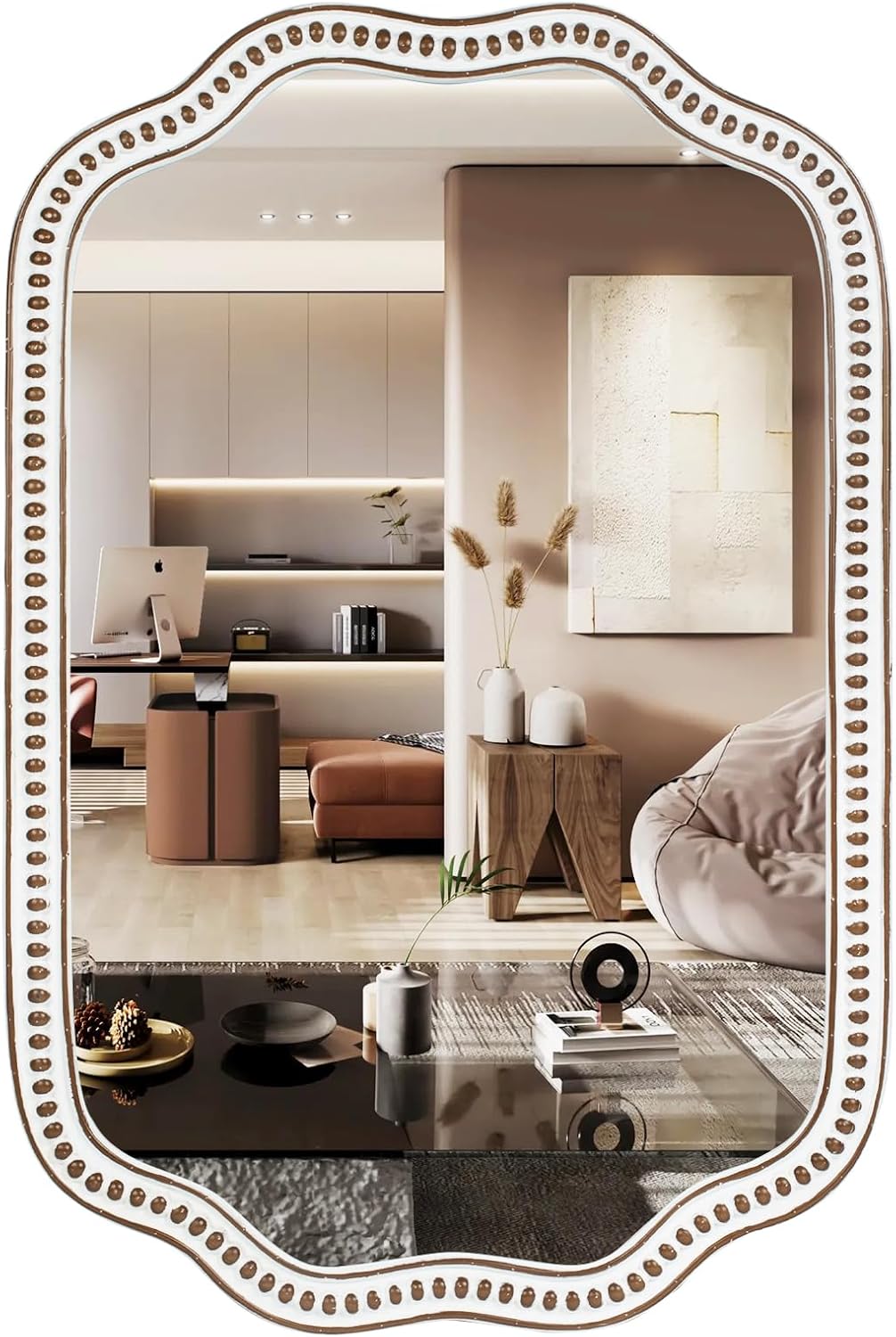 - Farmhouse Elegance with a Scalloped Frame: Add rustic charm to any space with this beautifully scalloped farmhouse wall mirror. The distressed white finish offers vintage appeal, making it an ideal accent mirror for wall decor in your living room, entryway, or bathroom