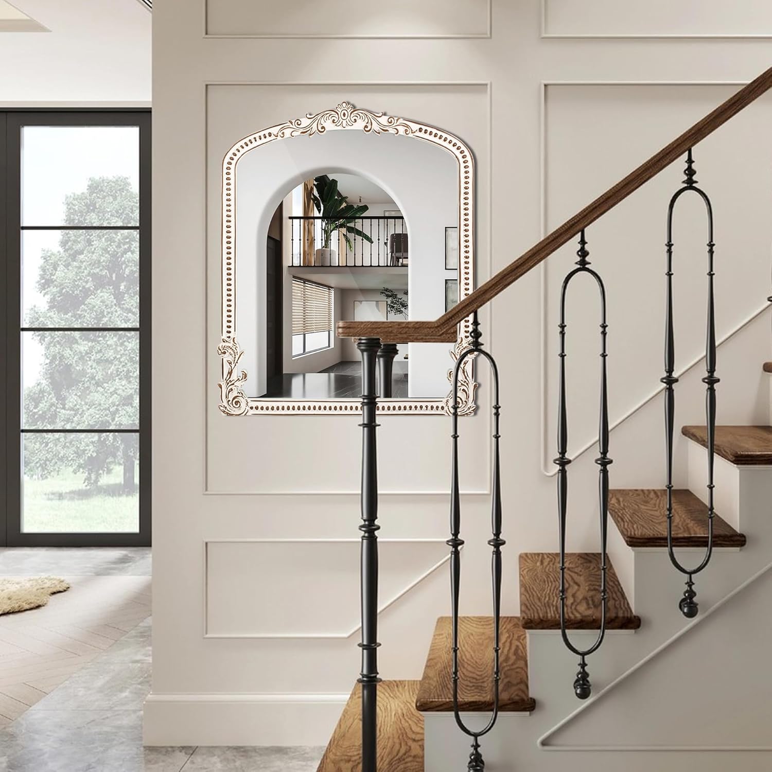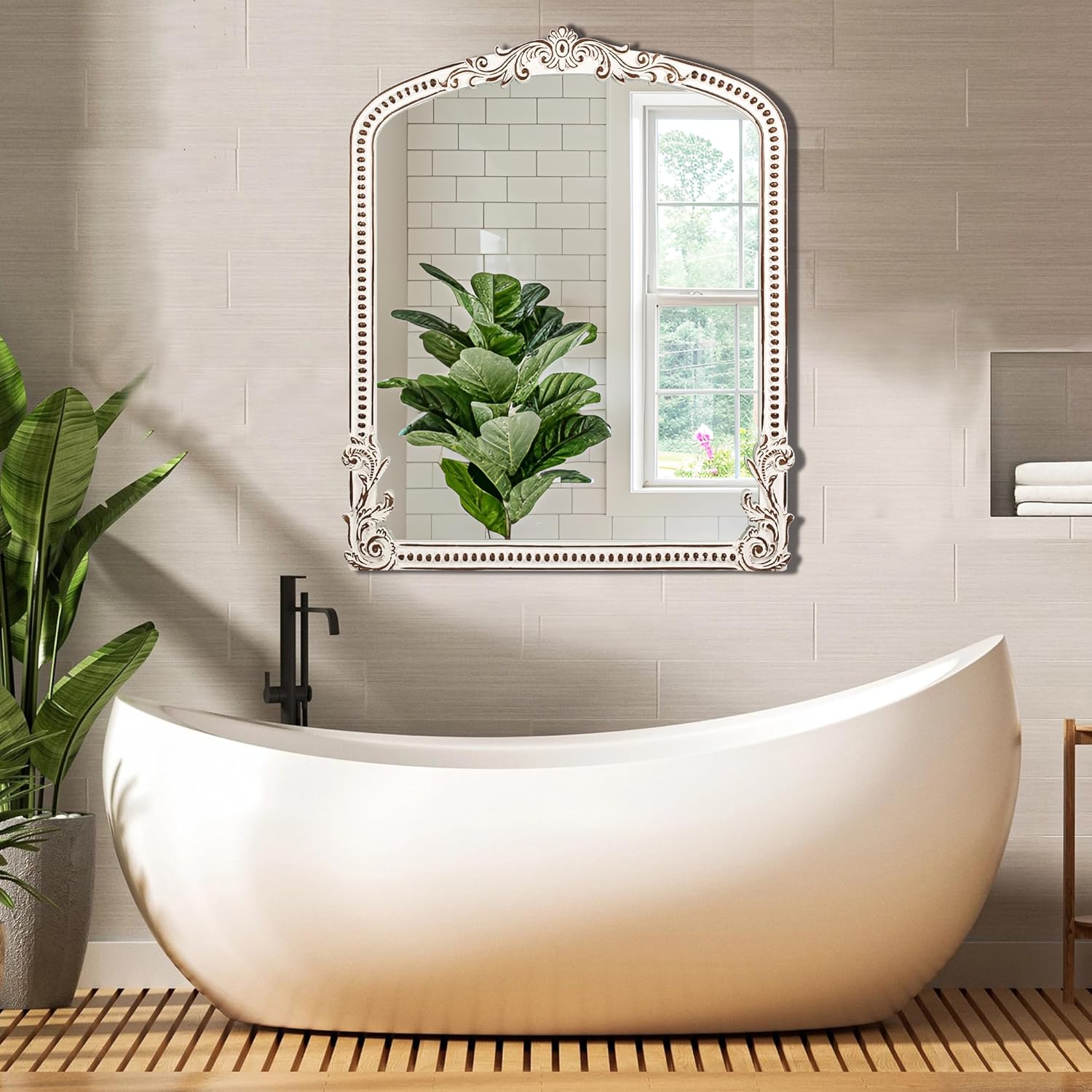 - Elegant Baroque Arch with Rustic Farmhouse Touch: Blending classic baroque flair with farmhouse wall mirror charm, this arched mirror features intricate curves and a distressed white wooden frame, perfect as a vintage wall mirror decorative for any space
