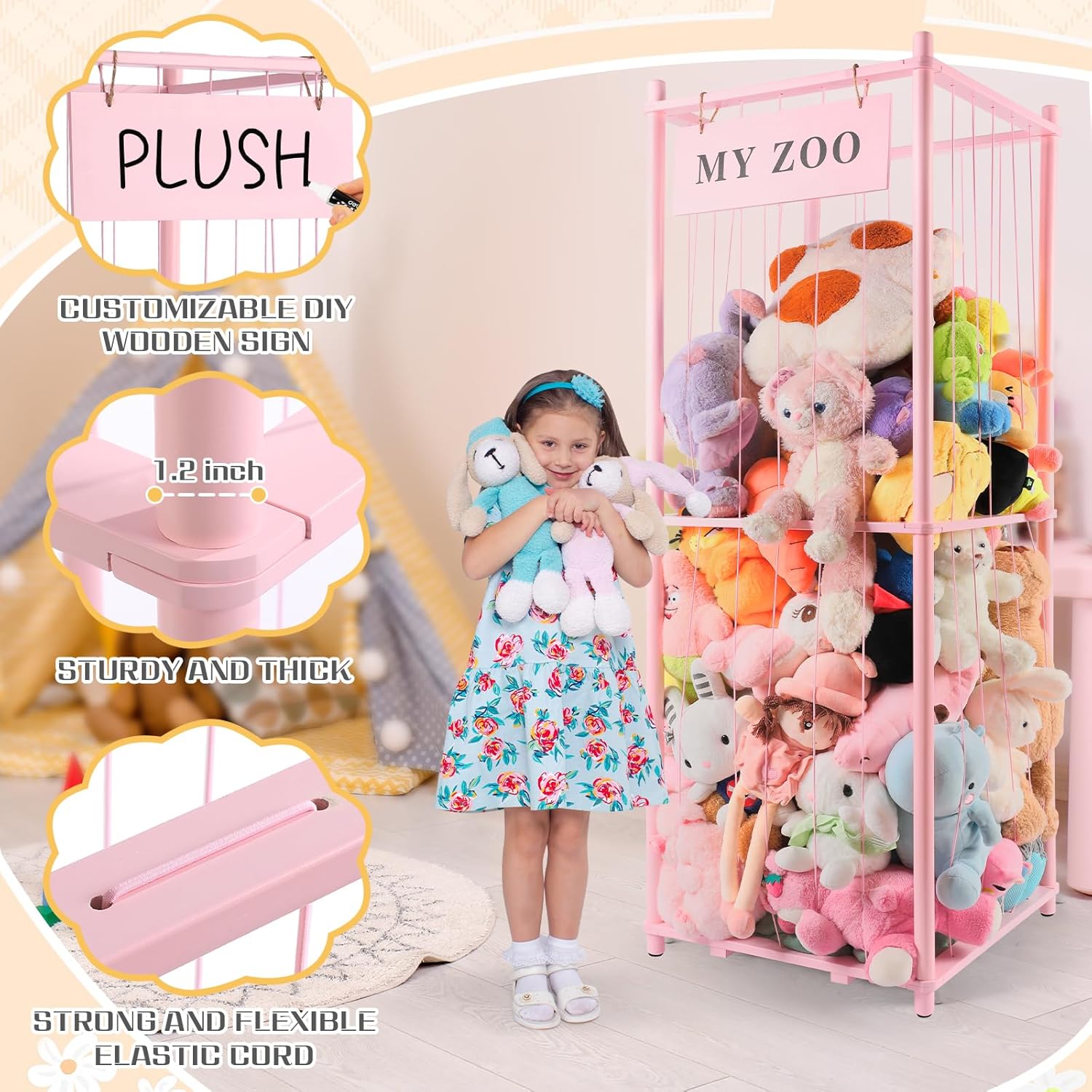Stuffed Animal Storage Zoo, Wooden Stuffed Animal Organizer with Elastic Cords for Boys Girls, Space Saving Toy Plushies Storage Holder for Playroom, Bedroom, Living Room (Pink, Large)