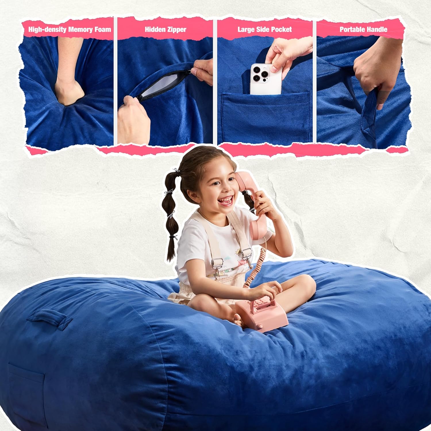 - Convenient Portability: Equipped with easy-to-grab handles and spacious side pockets, the bean bag couch is designed for maximum convenience. Move adult bean bag chair effortlessly around your home, and keep remotes, phones, or other essentials handy in the pockets.