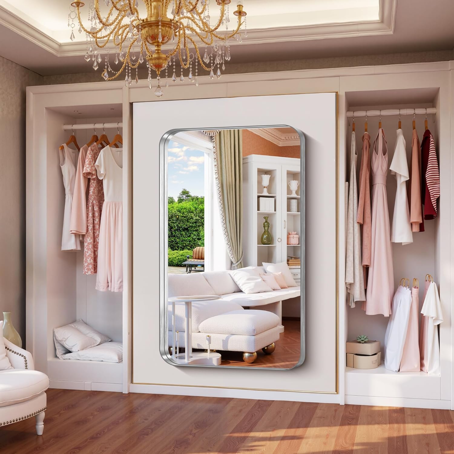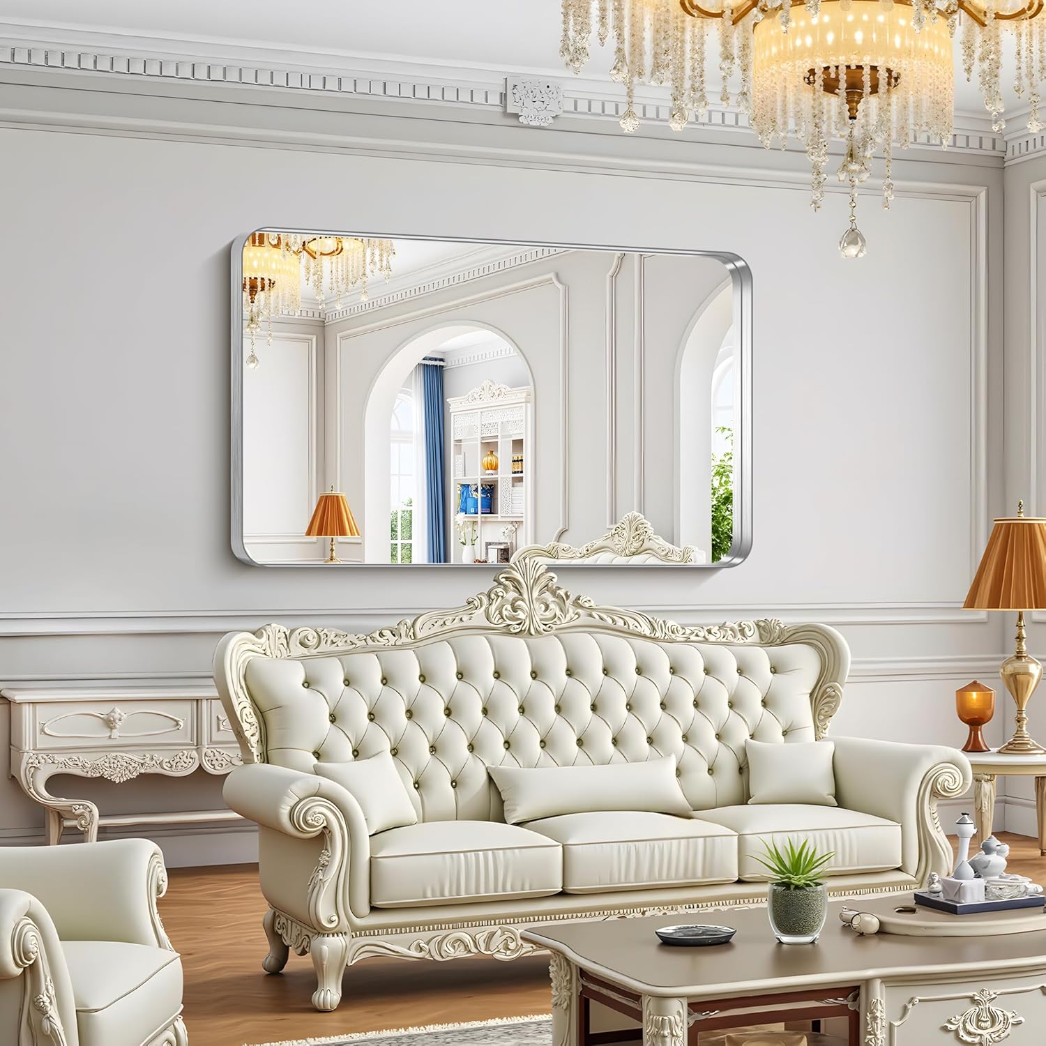 FORBATH 60x36 Inch Large Bathroom Mirror for Double Sinks, Brushed Silver Deep Frame Wall Mirror with Rounded Corners, Anti-Rust Tempered Glass for Modern Farmhouse Vanity (Horizontal/Vertical)