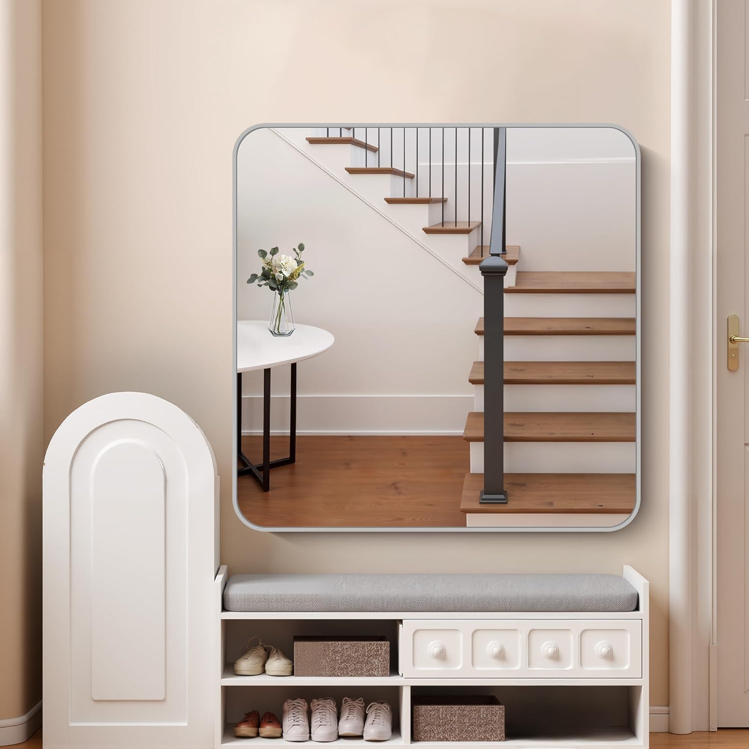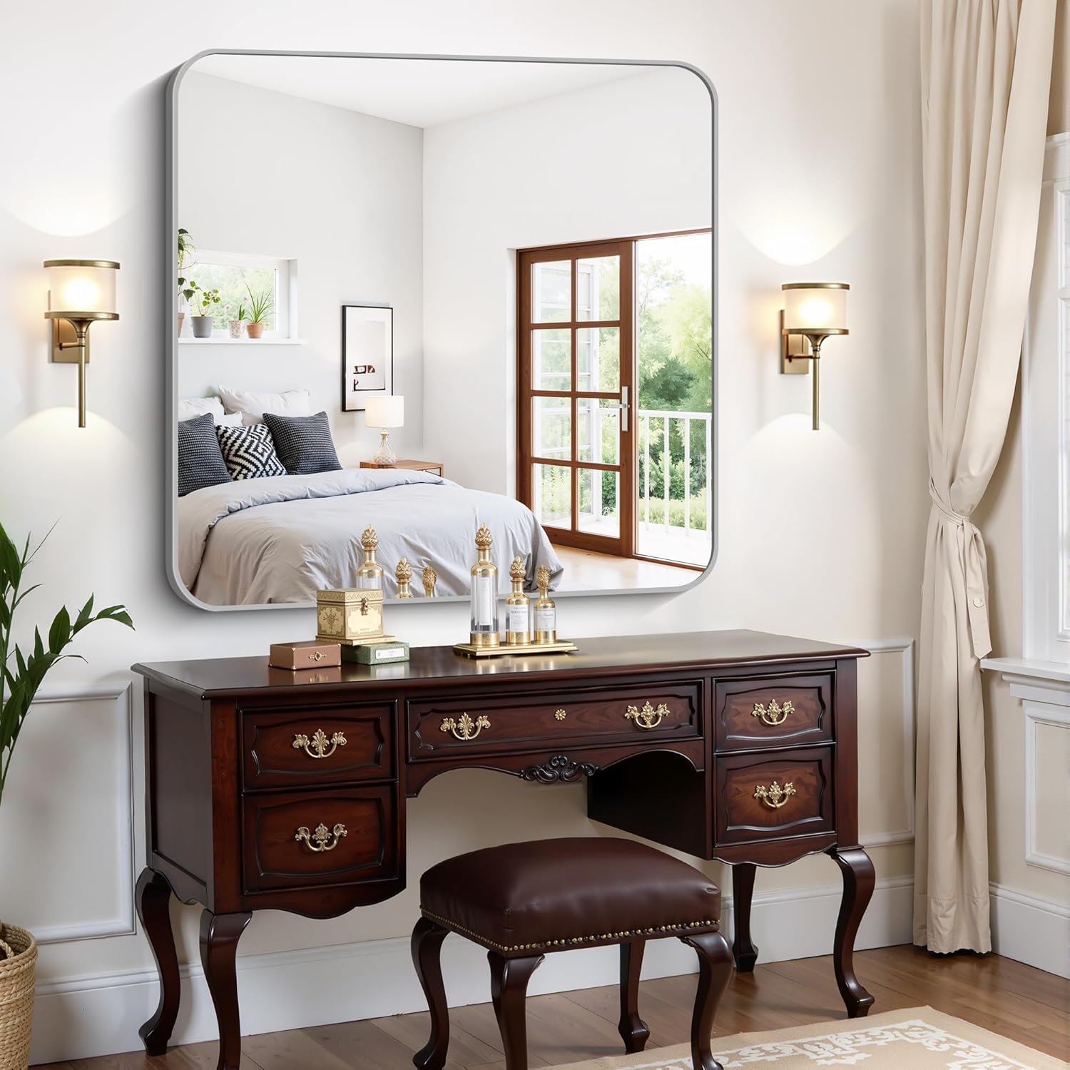 FORBATH 42x42 Inch Silver Bathroom Mirror for Over Sink, Large Square Wall Mirror with Metal Frame, Rounded Corners for Bathroom, Bedroom, Entryway Decor (Horizontal or Vertical)