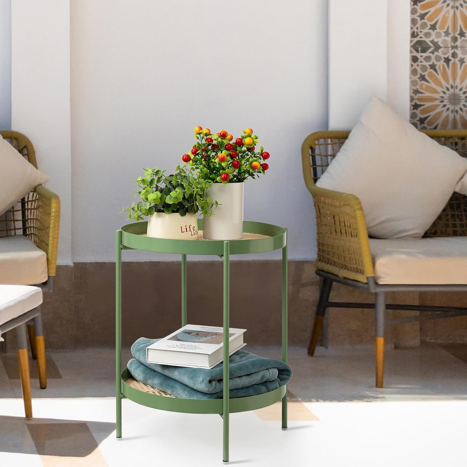 TeoKJ All Metal Side Table, 2 Tier Anti Rust End Table with Imitation Rattan Pattern on Removable Trays, Round Table for Living Room, Small Nightstand for Bedroom 20.47 Inch x 16.54 Inch Green