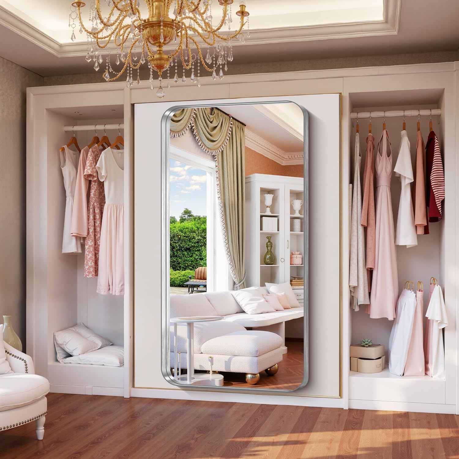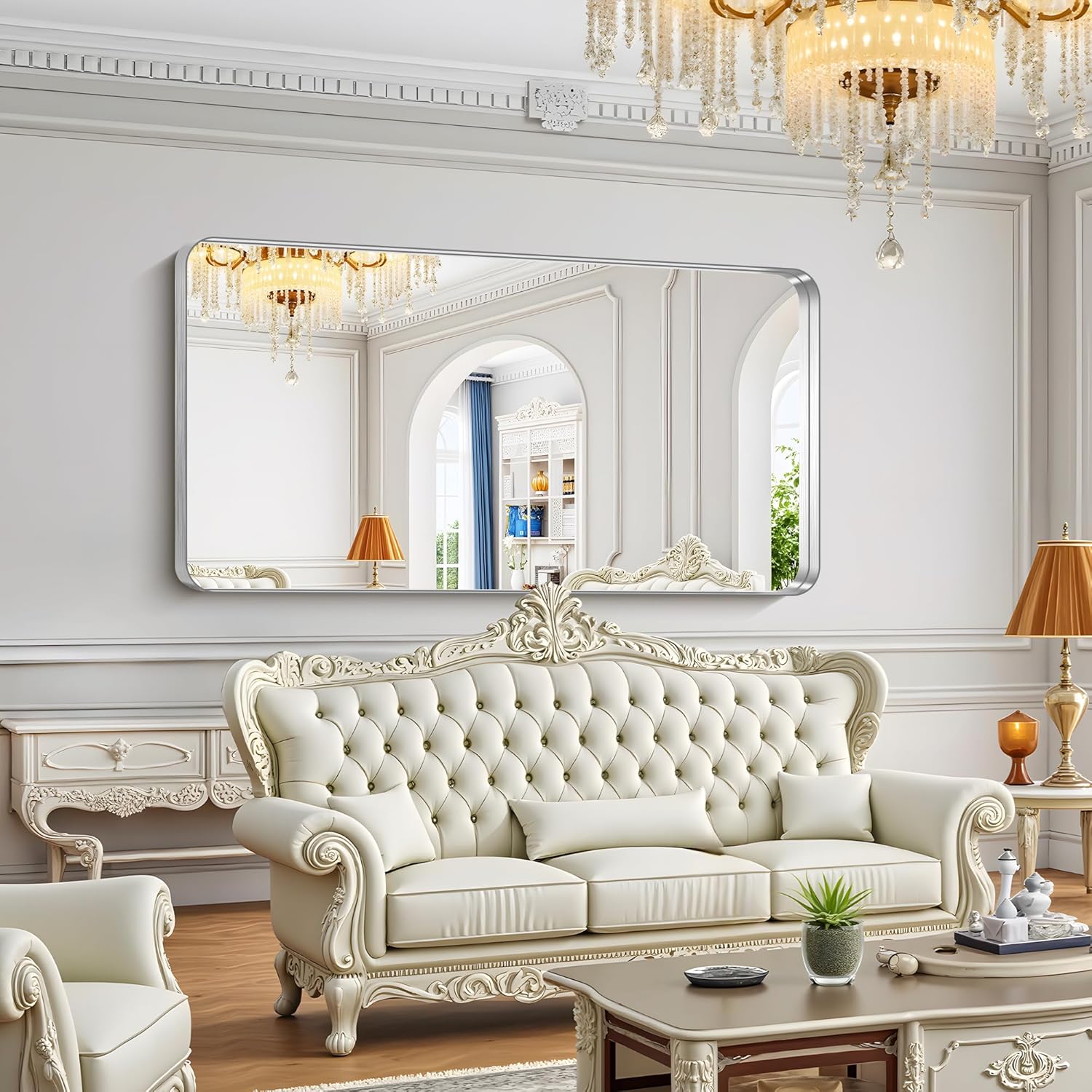 FORBATH 72x36 Inch Oversized Bathroom Mirror for Double Sinks, Brushed Silver Deep Frame Full Length Wall Mirror with Rounded Corners, Anti-Rust Tempered Glass (Horizontal/Vertical)