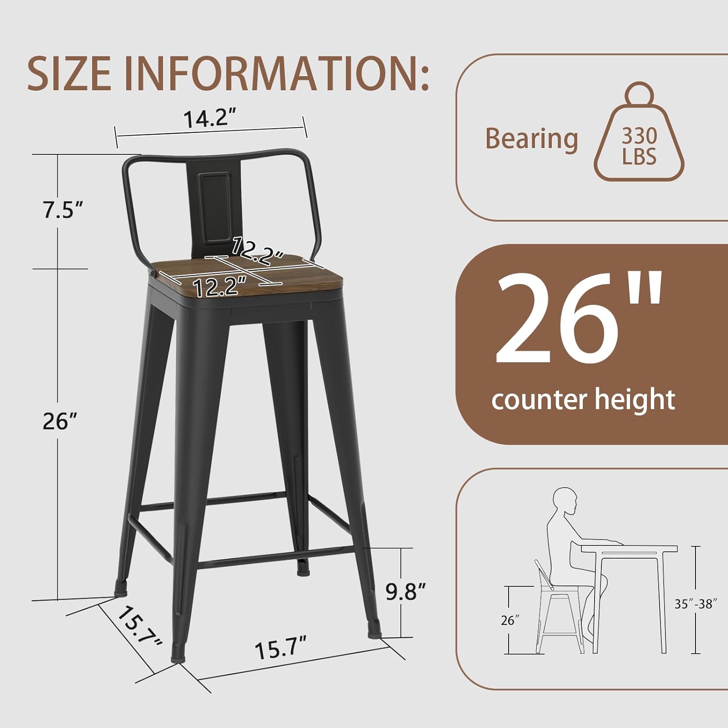 26 Inch Swivel Bar Stools Set of 4, Counter Height Bar Stools with Low Back, Metal Industrial Bar Chairs for Kitchen Island (Matte Black)