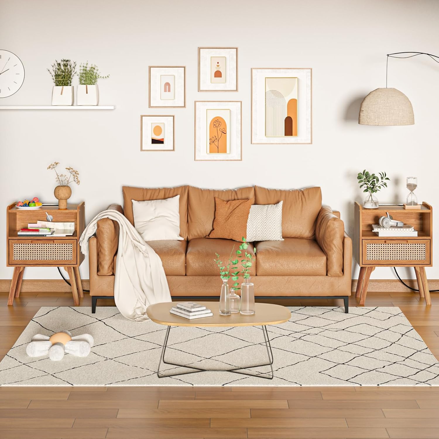 - [Brown Rattan Nightstand with Charging Station] The wood texture rattan night stand combines modern style and boho element. It is suitable for many styles of home decor and can help you transform your living space. The cane decorated drawer is beautiful and practical. Rattan furniture brings a perfect visual effect and adds charm to your home. 2 standard plug outlets and 2 USB ports allow you to charge multiple electronic devices at the same time. Everything is at your fingertips.