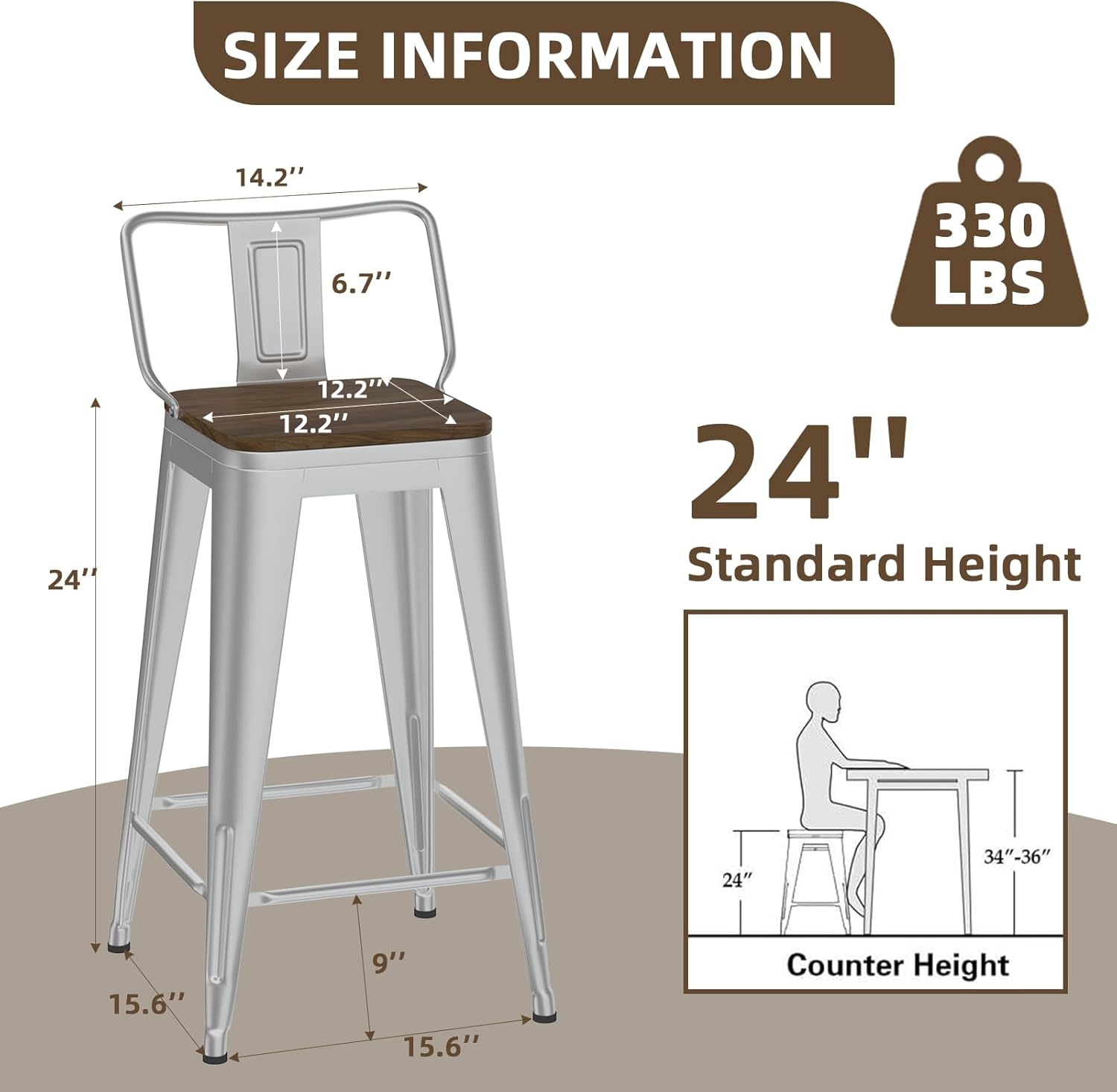 24 Inch Swivel Bar Stools Set of 4, Counter Height Bar Stools with Low Back, Metal Industrial Bar Chairs for Kitchen Island (Silver)