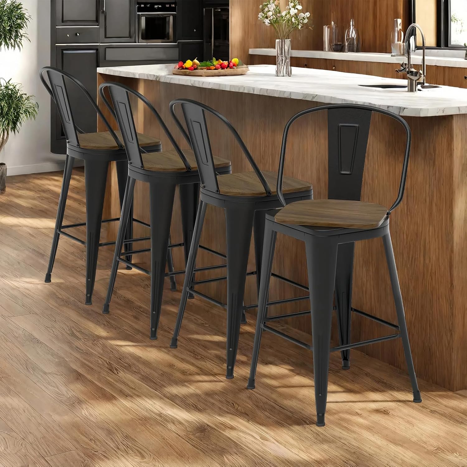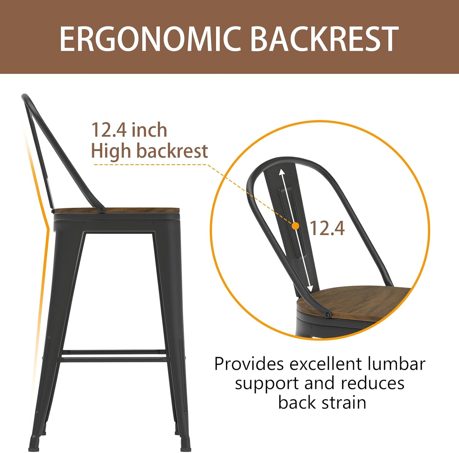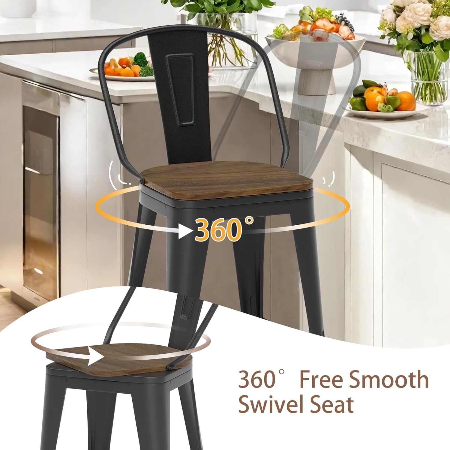 24” Swivel Bar Stools Set of 4, Counter Height Bar Stools Wooden Seat, Metal Industrial Bar Chairs with High Back for Kitchen Island (Black)