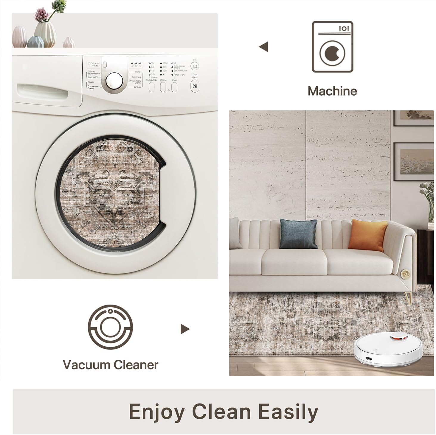 GENIMO 8x10 Area Rugs for Living Room, Machine Washable Non Slip Vintage Rugs, Low Pile Lightweight Chenille Print Rug for Bedroom, Dining Room, Home Office, Brownish Drab
