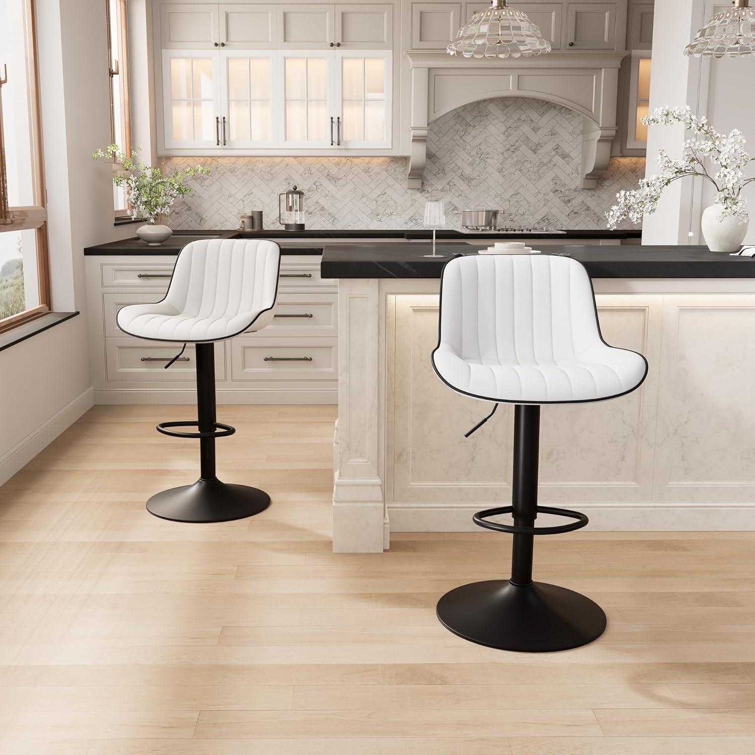 YOUNIKE White Bar Stools Set of 2 Kitchen Counter Height Barstools Upholstered Swivel Modern Faux Leather Bar Chairs with Backs Adjustable High Breakfast Island Stool with Metal Leg