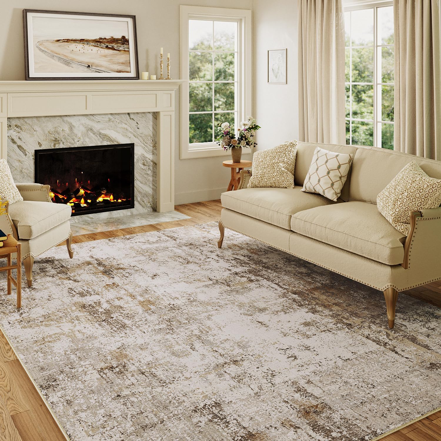 12x15 Washable Area Rug Brown Grey Abstract Neutral Living Room Bedroom Large Throw Rug Non Slip Soft Distressed Low Pile Indoor Floor Carpet for Kitchen Office Entryway