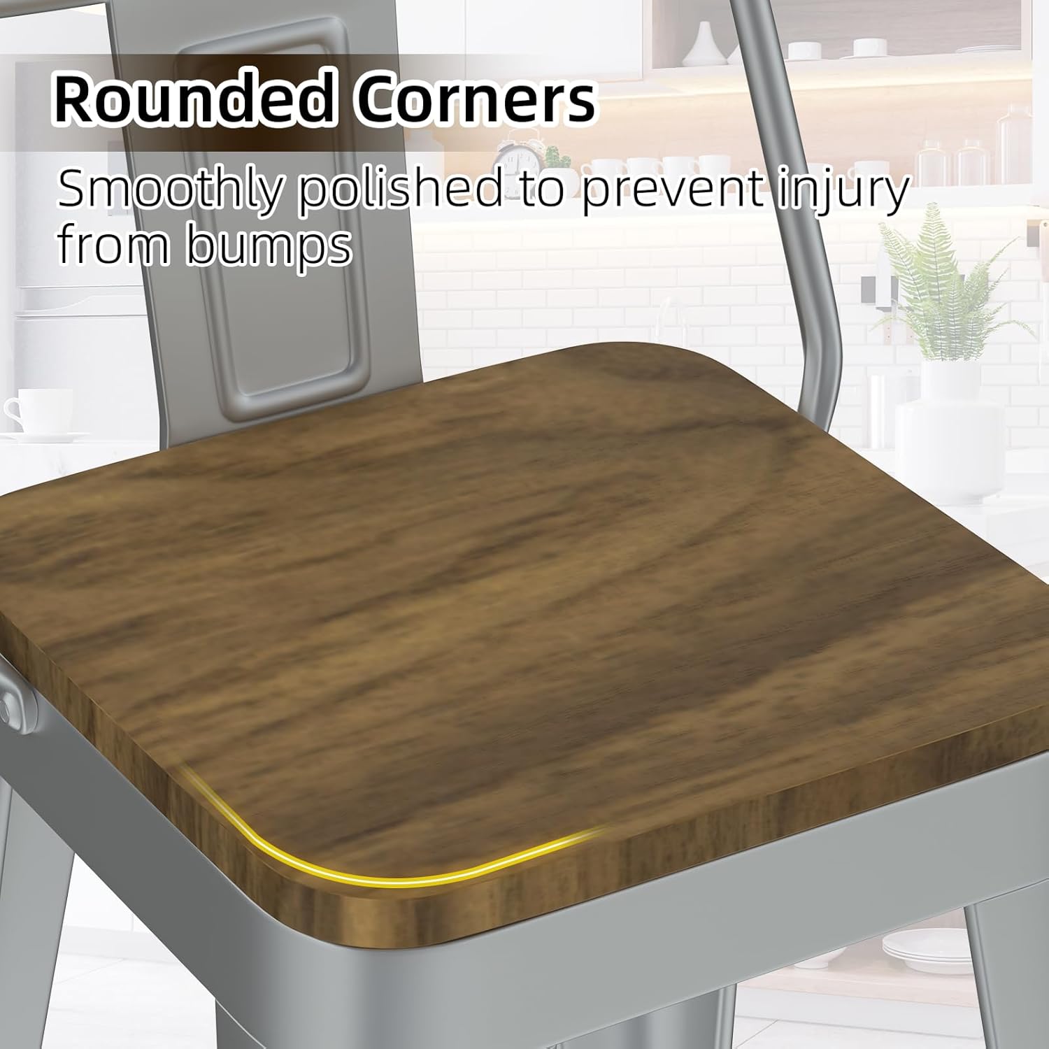 Silver Bar Stools Set of 4, Metal Bar Stools with Wooden Seat, Modern 26”Counter Height Barstools with Low Back