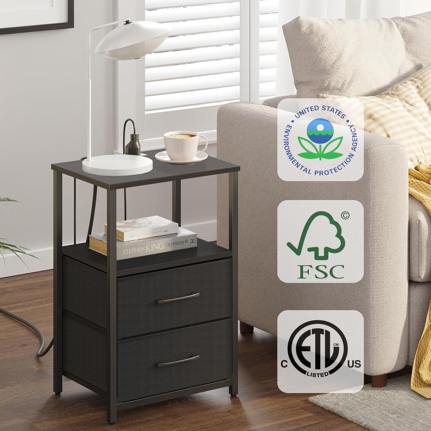 TUTOTAK End Table with Charging Station, Night Stand, Side Table with 2 USB Ports and Outlets, Nightstand with Cloth Drawer, Bedside Table for Livingroom, Bedroom Black TB01BK088