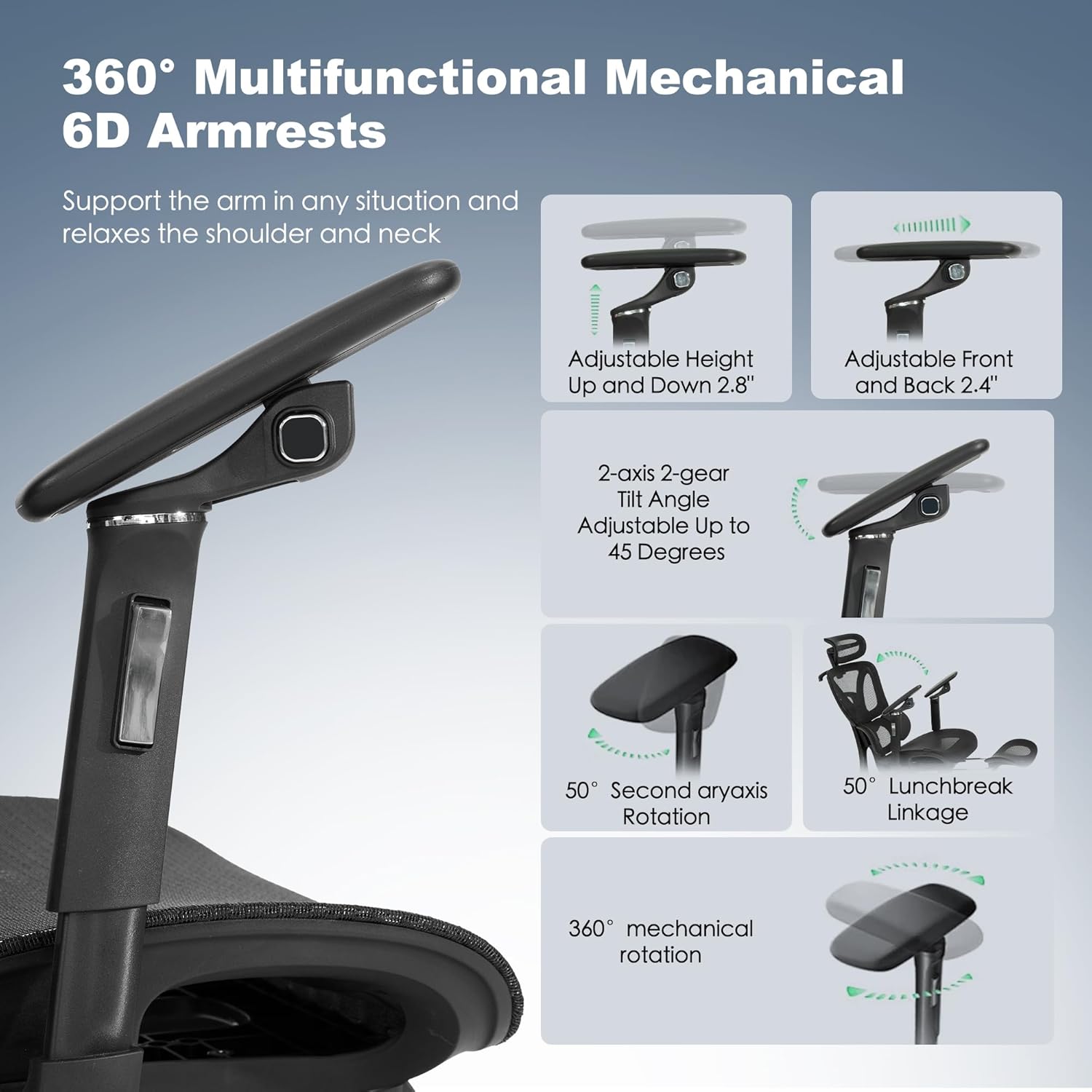 - 【6D Adjustable Armrest】The armrest of this ergonomic mesh office & gaming chair can be adjusted in six directions: up and down, forward and backward, left and right, tilting, upward rotation, and downward rotation. Whether you're working at your desk or gaming for hours, it lets you find the most comfortable arm position to reduce strain. Crafted with skin-friendly soft PU material, the armrests provide stable support for your arms—perfect for keeping your hands relaxed during intense gaming sessions, so you can stay focused on the game without discomfort.