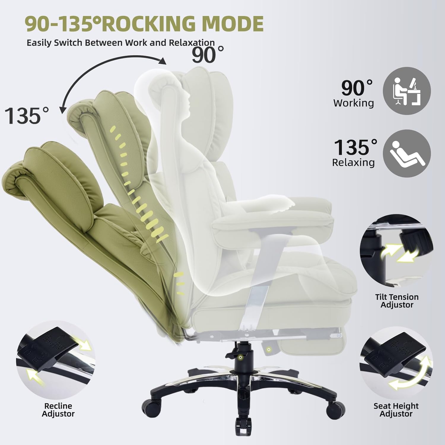- Multi-Functional Adjustment for Versatile Use: This reclining office chair offers 3 inches of height adjustment and a 90°-135° reclining range for optimal work and relaxation positions. Its 360° swivel boosts mobility and communication, enhancing productivity. Whether as an executive office chair, conference chair, home office chair, or gaming chair, video game chair, the ergonomic design adapts seamlessly to any setting, improving your seating experience.