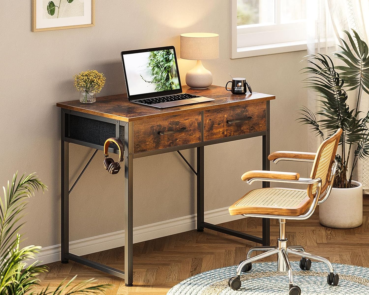 Casaottima 32 Inch Small Office Computer Desk with 2 Drawers & Headphone Hook - Compact Writing Desk for Home Office, Study or Work, Modern Space-Saving Design for Small Spaces, Pure Vintage