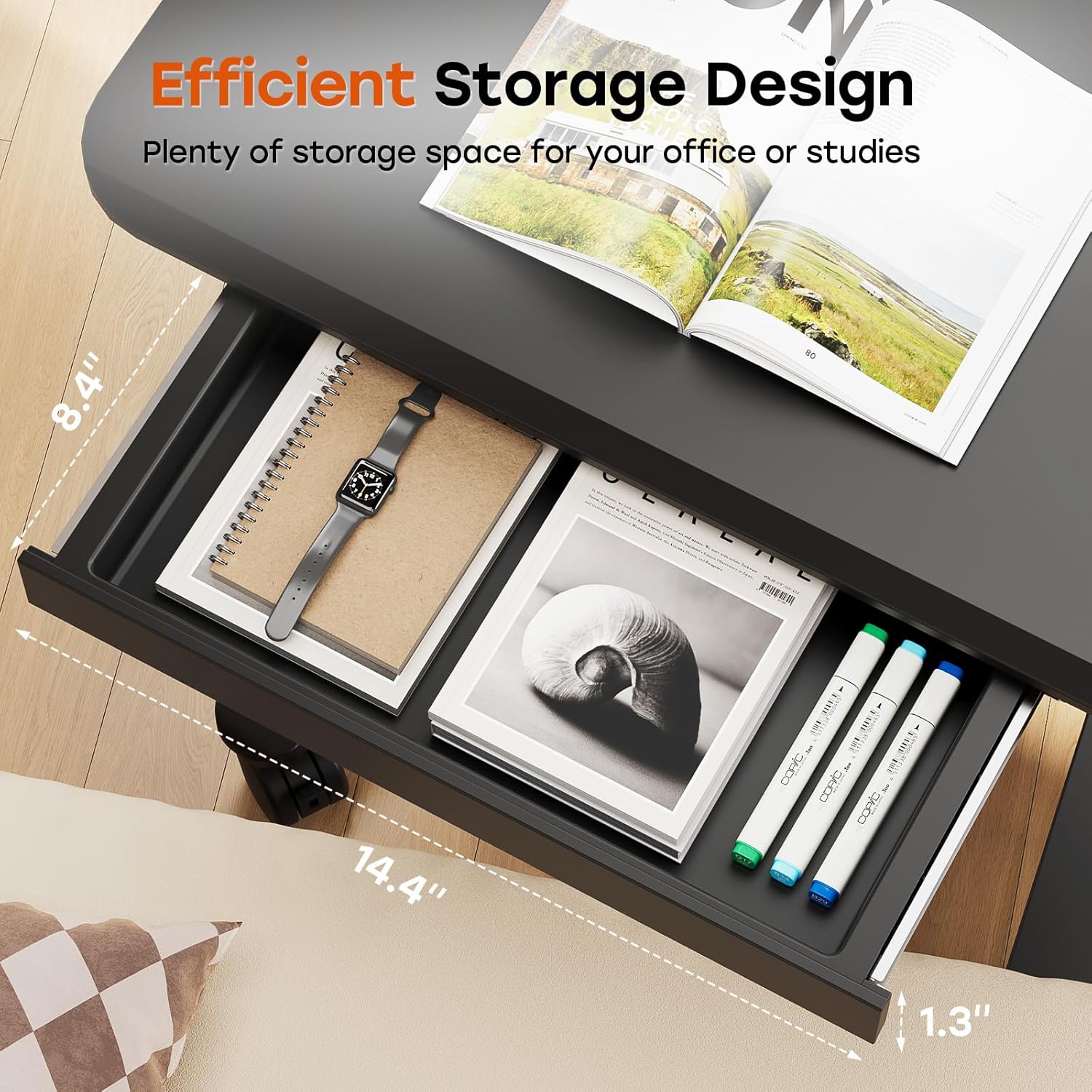 - Convenient Storage Drawer: Small standing desk features a drawer (Size: 14.4"×8.4"×1.3") that offers generous storage for office supplies, helping maintain a clean workspace. Additionally, 2 hooks design facilitates organization of headset or backpack